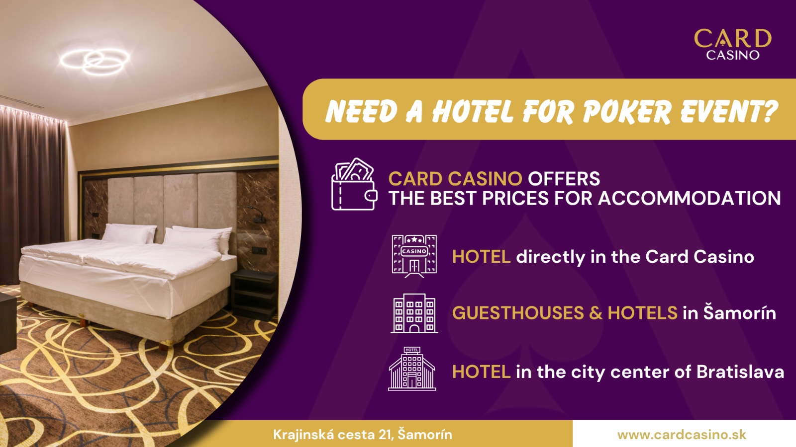 Die passende Unterkunft bei den Pokerturnieren zu finden ist nicht immer ganz so einfach, vor allem wenn es direkt vor Ort nur wenige Zimmer gibt. Mit dem Umzug des Card Casinos von Bratislava nach Samorin hat man nun auch ein eigenes Hotel mit einigen Zimmern, dazu kommen noch Deals mit einigen Hotels in näherer Umgebung, die man direkt über das Card Casino buchen kann.