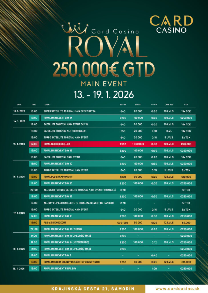 Im Cash Game sorgt die Poker Travel Cash Game Tour ab € 5/5 NLH bzw. € 5/5 PLO weiterhin für Action, gestartet werden die Cash Games wie immer ab den Blinds € 1/2 NLH bzw. € 2/2 PLO. Alle Details zum kompletten Angebot findet Ihr unter cardcasino.sk.
