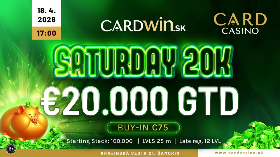 Auch heute gibt es Action, das € 75 Saturday 20k (€ 20.000 GTD/100k/25′) wartet. Kommende Woche geht es dann schon bei der Peoples Poker Tour an die Tische, € 400.000 Preisgeld warten. Die Cash Games starten wie immer ab den Blinds € 1/2 NLH bzw. € 2/2 PLO. Übrigens, Ihr könnt Euch schon jetzt Vorteilspackages für den WSOP Circuit im August sichern. Alle Details zum kompletten Angebot findet Ihr unter cardcasino.sk.
