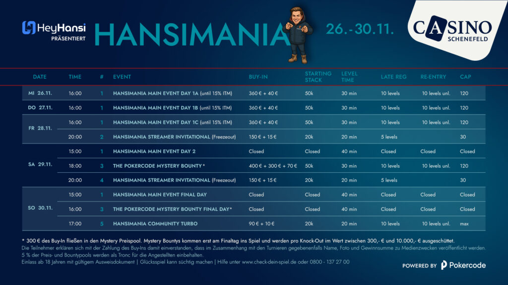 Das Casino Schenefeld begrüßt mit Jan „HeyHansi“ Wagner von 26. bis 30. November wieder die Poker Community bei einer neuen Ausgabe der Hansimania. Natürlich mit vielen Streamern und der Pokercode Community.