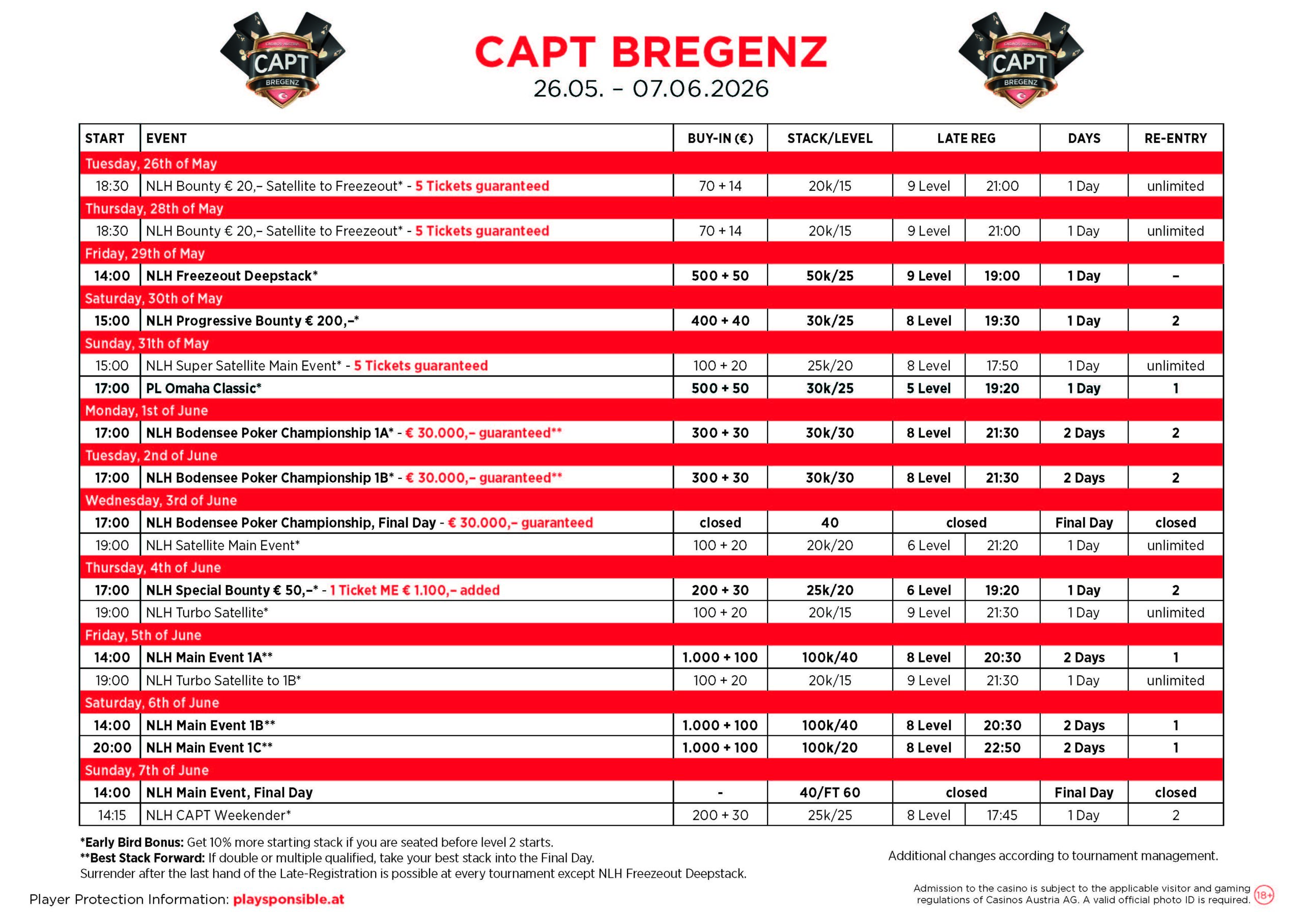 Alle Details und Turnierstrukturen sind auf der Poker-Webseite der Casinos Austria zu finden. Bei Fragen helfen die Pokermanager der Casinos gerne weiter.