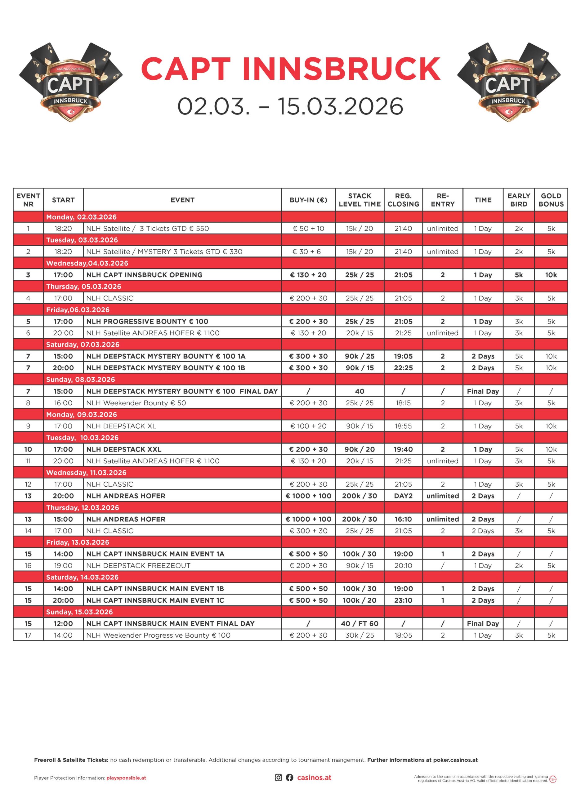 Die Satellites Woche läuft schon auf Hochtouren und schon bei der CAPT Seefeld hat sich gezeigt, wie gut die Option angenommen wird. Sowohl im Casin Seefeld als auch in Innsbruck werden verschiedenen Satellites bis zum 28. Februar angeboten. Von 4. bis 15. März läuft die CAPT Innsbruck 2026 und sie hat einige Highlights. So steht das erste Wochenende im Zeichen des € 200 + 100 + 30 Deepstack Mystery Bounty, das mit 90.000 Chips und 25 bzw. 40 Minuten Levels gespielt wird. Neu im Programm ist auch das zweitägige € 1.000 + 100 Andreas Hofer (200k/30′). Auch hier gibt es eine eigens angefertigte Trophäe – die auf jeden Fall einige Spieler anlocken wird. Das € 500 + 50 Main Event der CAPT Innsbruck läuft von 13. bis 15. März mit drei Flights und einem Finaltag.