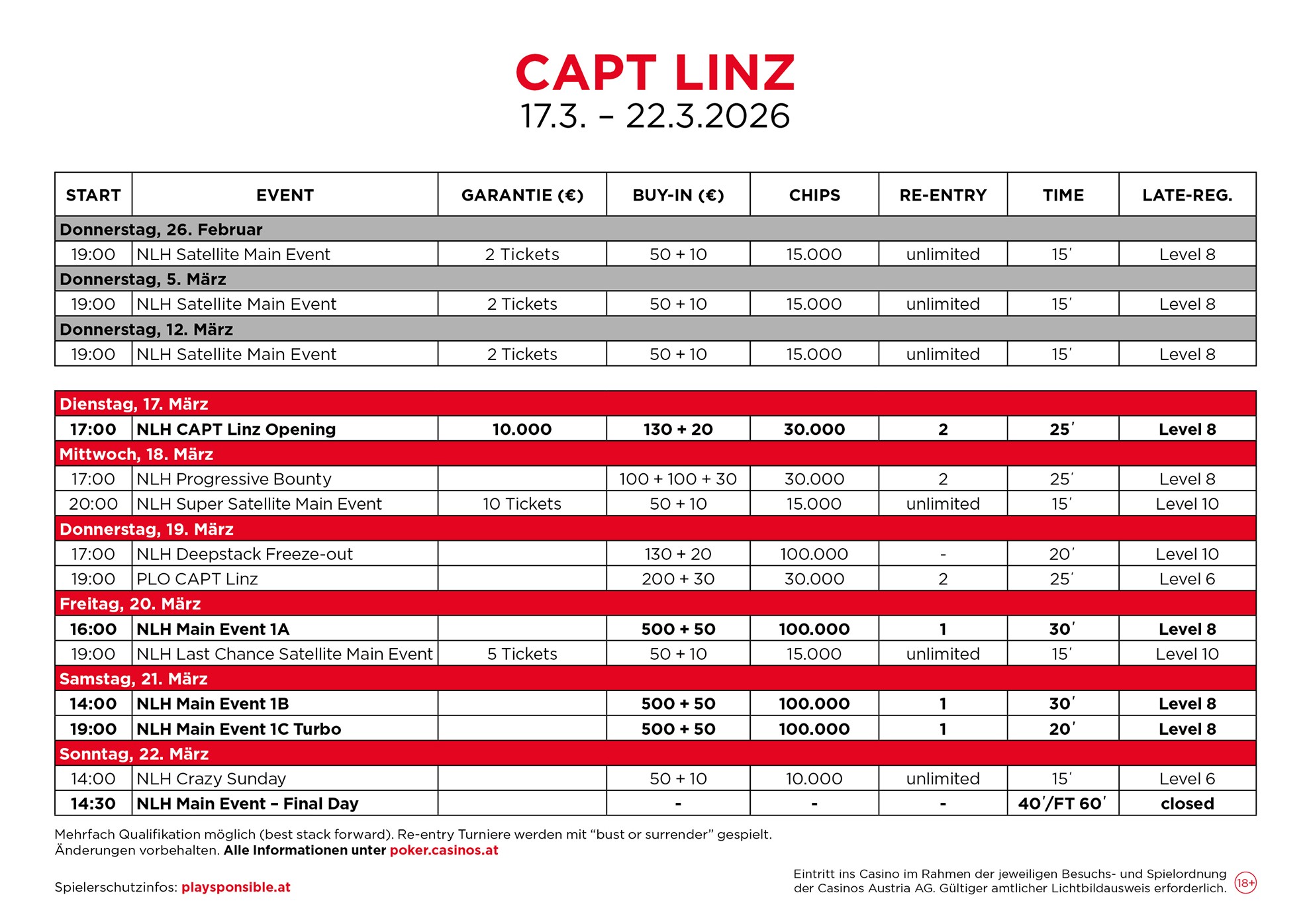 Das Casino Linz darf sich über eine stetig wachsende Poker Community freuen und so darf man gespannt sein, wie sich die CAPT Linz dieses Jahr entwickelt. Beim € 130 + 20 Opening warten € 10.000 GTD, das Main Event hat wie gewohnt ein Buy-In von € 500 + 50 und wird natürlich wieder mit drei Flights und einem Finaltag gespielt.