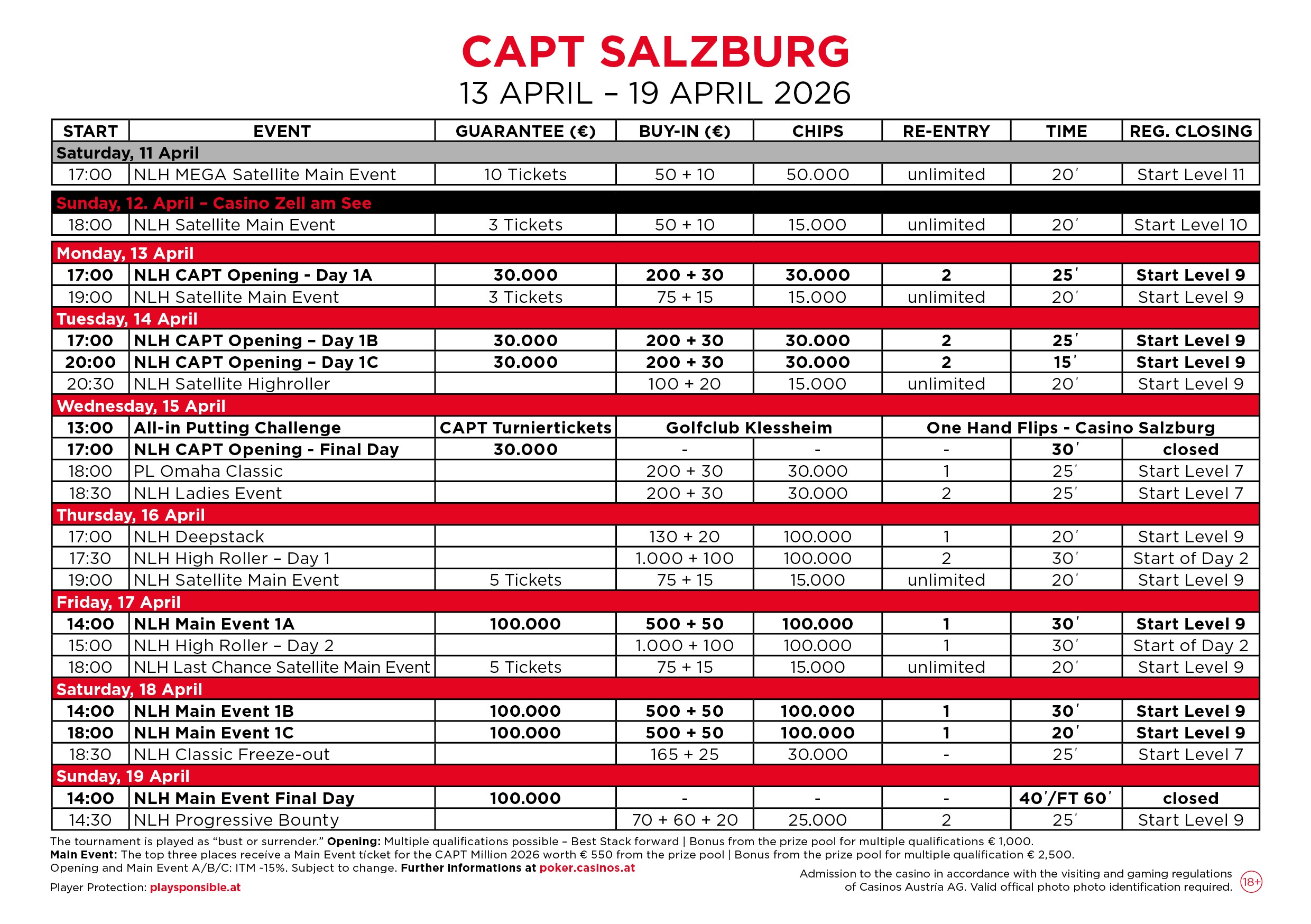 Das € 500 + 50 Main Event kommt dieses Jahr wieder mit einer € 100.000 Preisgeldgarantie (inkl. 3 x € 550 CAPT Million Tickets). Gespielt wird mit 100.000 Chips und 30 Minuten Levels in den zwei regulären Flights, der Turbo am Samstag hat 20 Minuten Levels. Das Finale am Sonntag wird wie immer mit 40 bzw. 60 Minuten Levels gespielt. Die Flights werden jeweils ins Geld gespielt, damit hat jeder den Min-Cash sicher. Auch hier ist die Doppelqualifikation erlaubt und bringt € 2.500 Bonus. Die Messlatte beim Main Event liegt hoch, denn letztes Jahr gab es mit 365 Entries einen neuen Rekord. Allerdings haben sich auch schon wirklich viele für die CAPT Salzburg 206 angekündigt und man darf sich auf ein grandioses Event freuen.