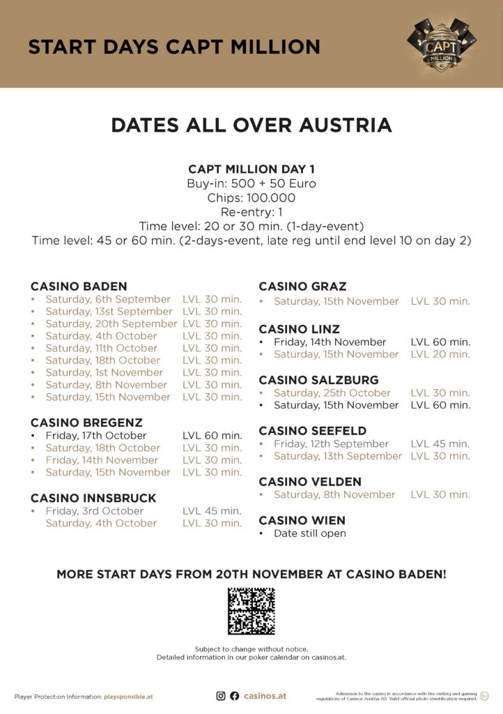 Bei Fragen rund um die CAPT Million steht Euch auch gerne Thomas Lamatsch (Pokermanager Casinos Austria) unter +43 664 78284910 oder thomas.lamatsch@casinos.at zur Verfügung. Wie immer gibt es alle Infos zum Pokerangebot der Casinos Austria unter poker.casinos.at.