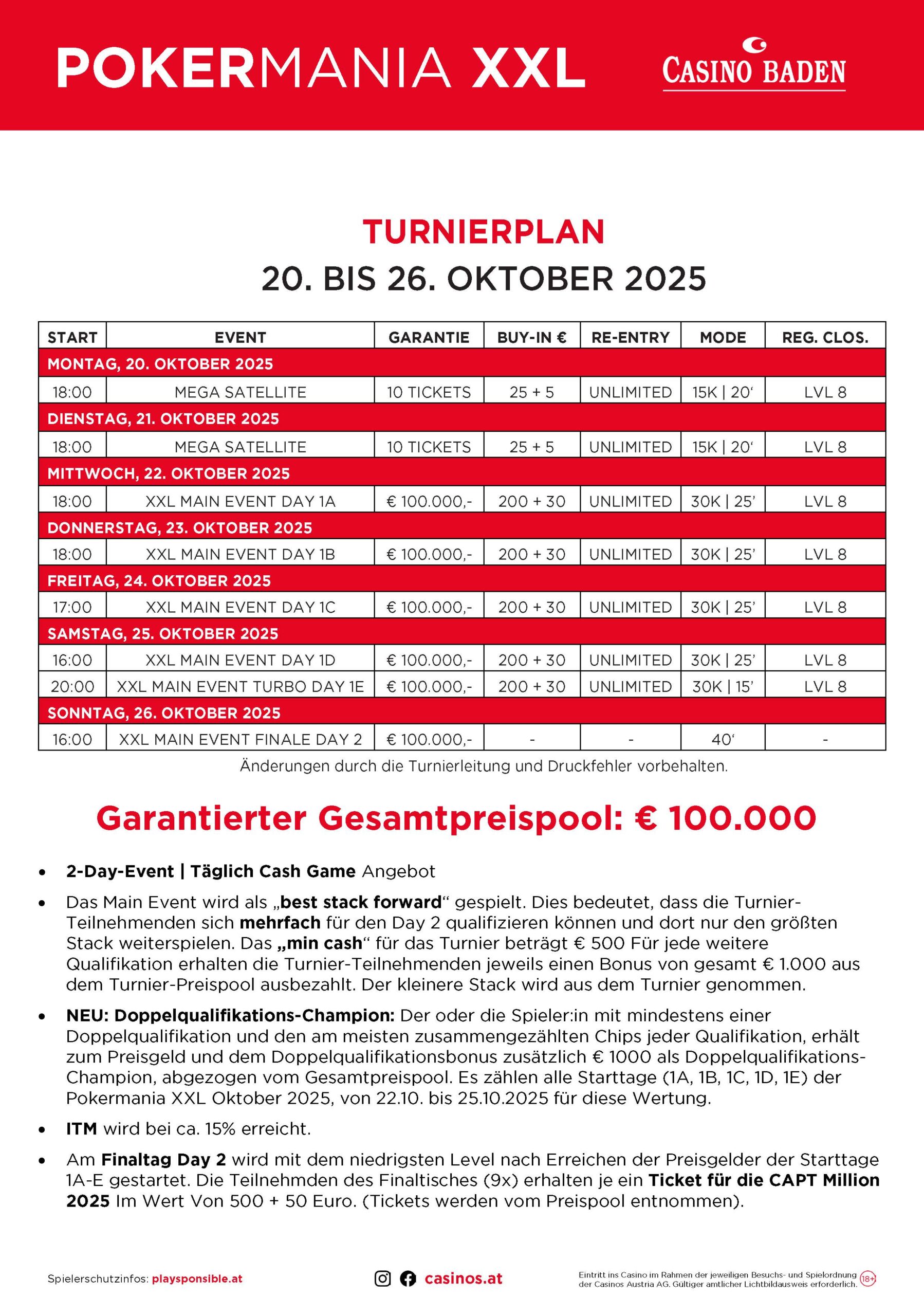 Bei den Cash Games geht es heute wie immer ab € 1/3 NLH bzw. 2/2 PLO an die Tische. Alle Infos findet Ihr auf baden.casinos.at.