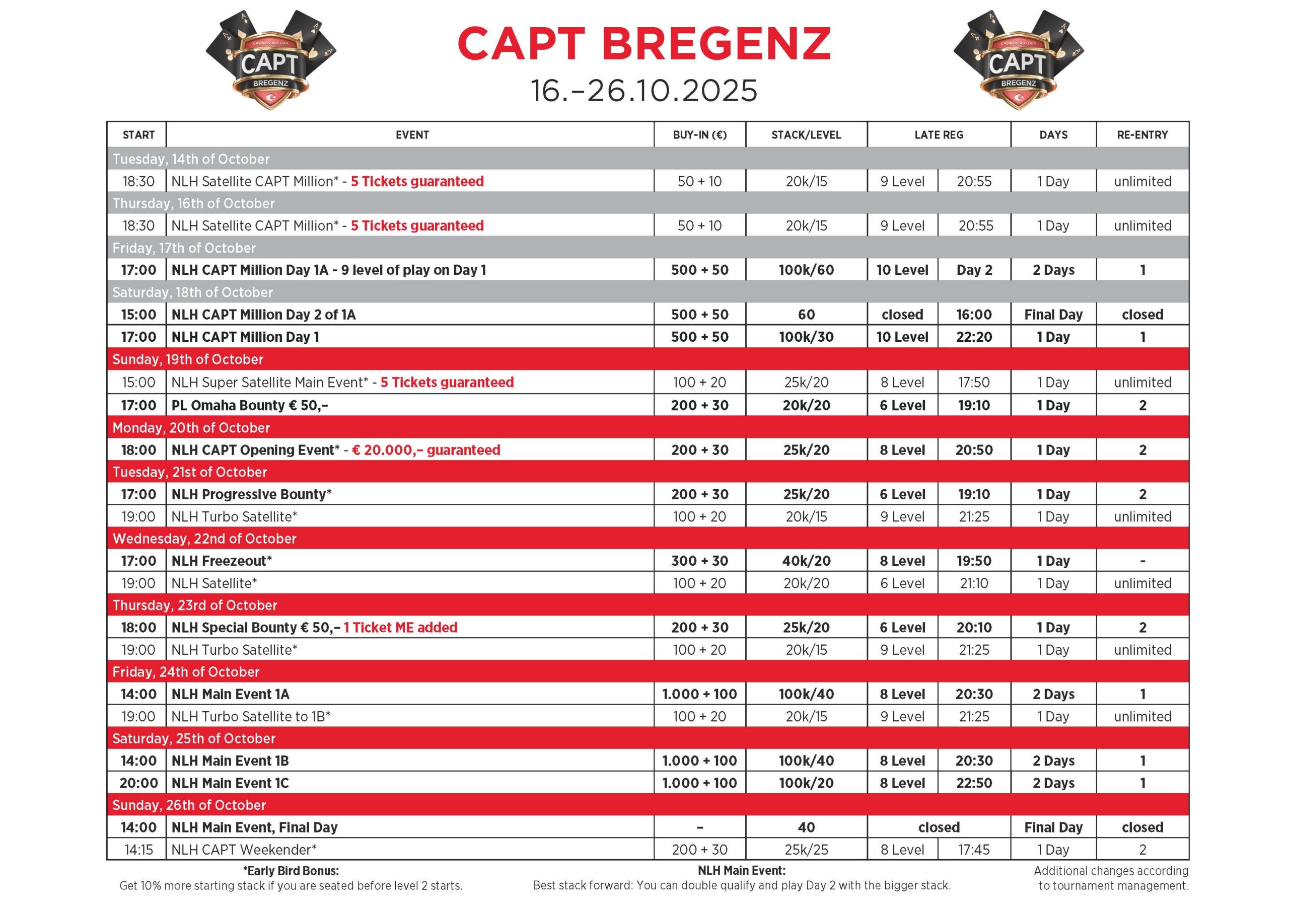 Bei den Cash Games gibt es heute € 1.000 extra zu gewinnen, es wird ab € 1/3 NLH bzw. € 2/2 PLO, meist aber ein wenig höher gespielt. Alle Infos zum Pokerangebot findet Ihr unter bregenz.casinos.at.