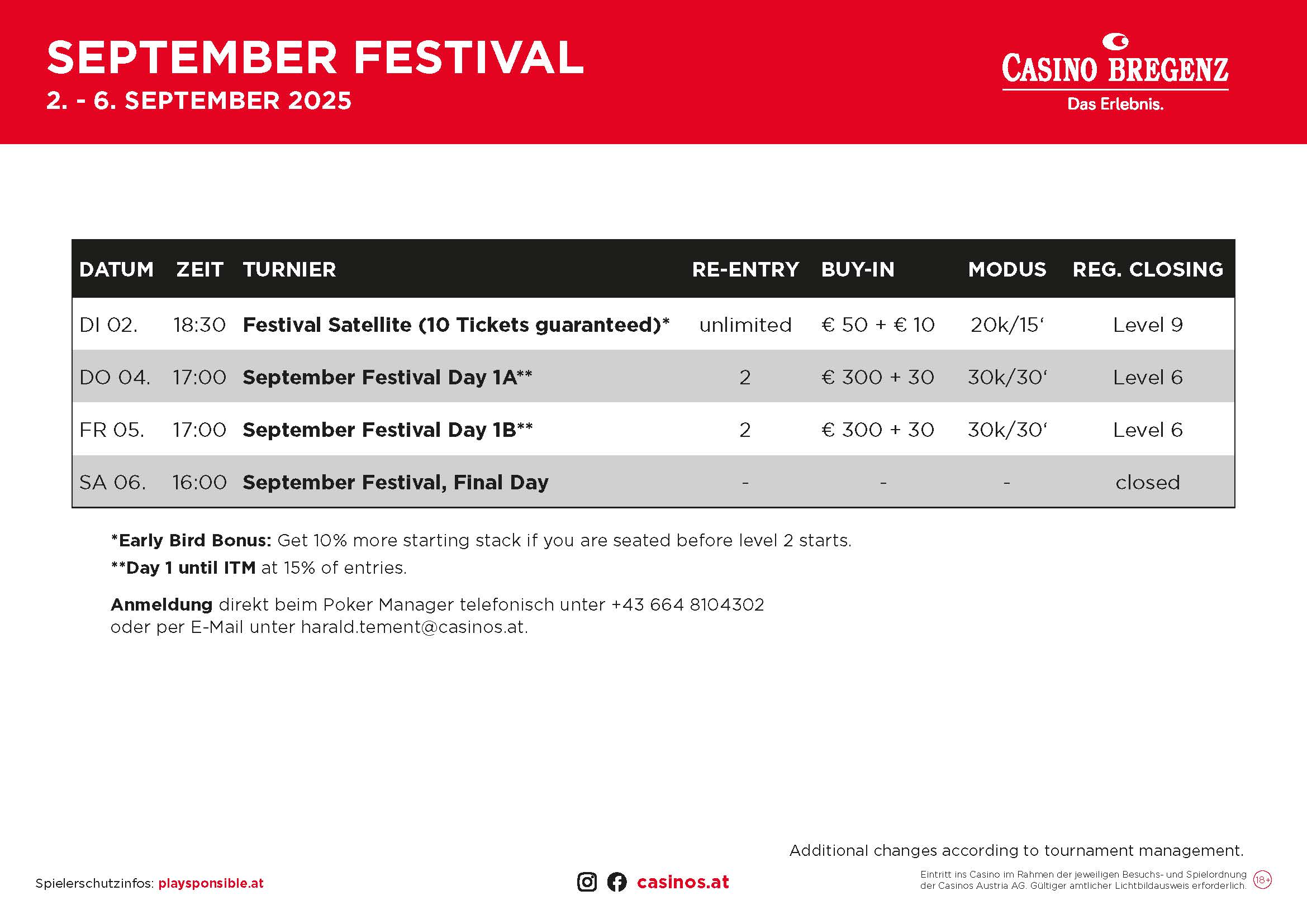 Das € 300 + 30 September Festival im Casino Bregenz wurde gestern, den 4. September, mit dem ersten der beiden Starttage eröffnet. DJ RR ist der Chipleader.