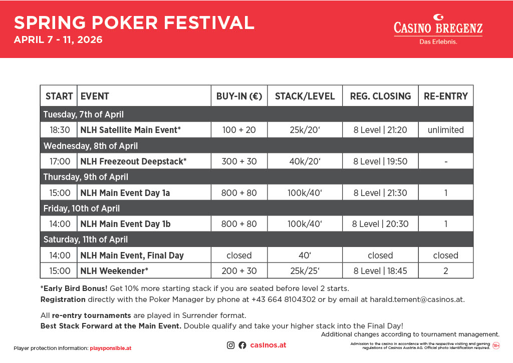 Neben den beiden CAPT Stopps hat das Casino Bregenz auch einige Specials im Programm. Dazu gehört das Spring Poker Festival, das diese Woche mit einem € 800 + 80 Main Event gefeiert wird.