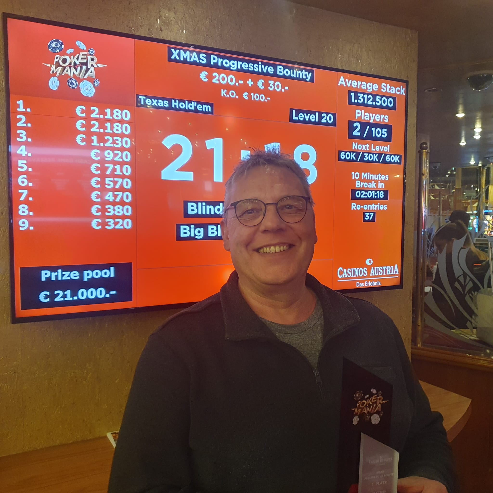 Uli sicherte sich gestern, den 5. Dezember, das € 100 + 100 + 30 PKO Bounty der Pokermania XMas Edition im Casino Bregenz.