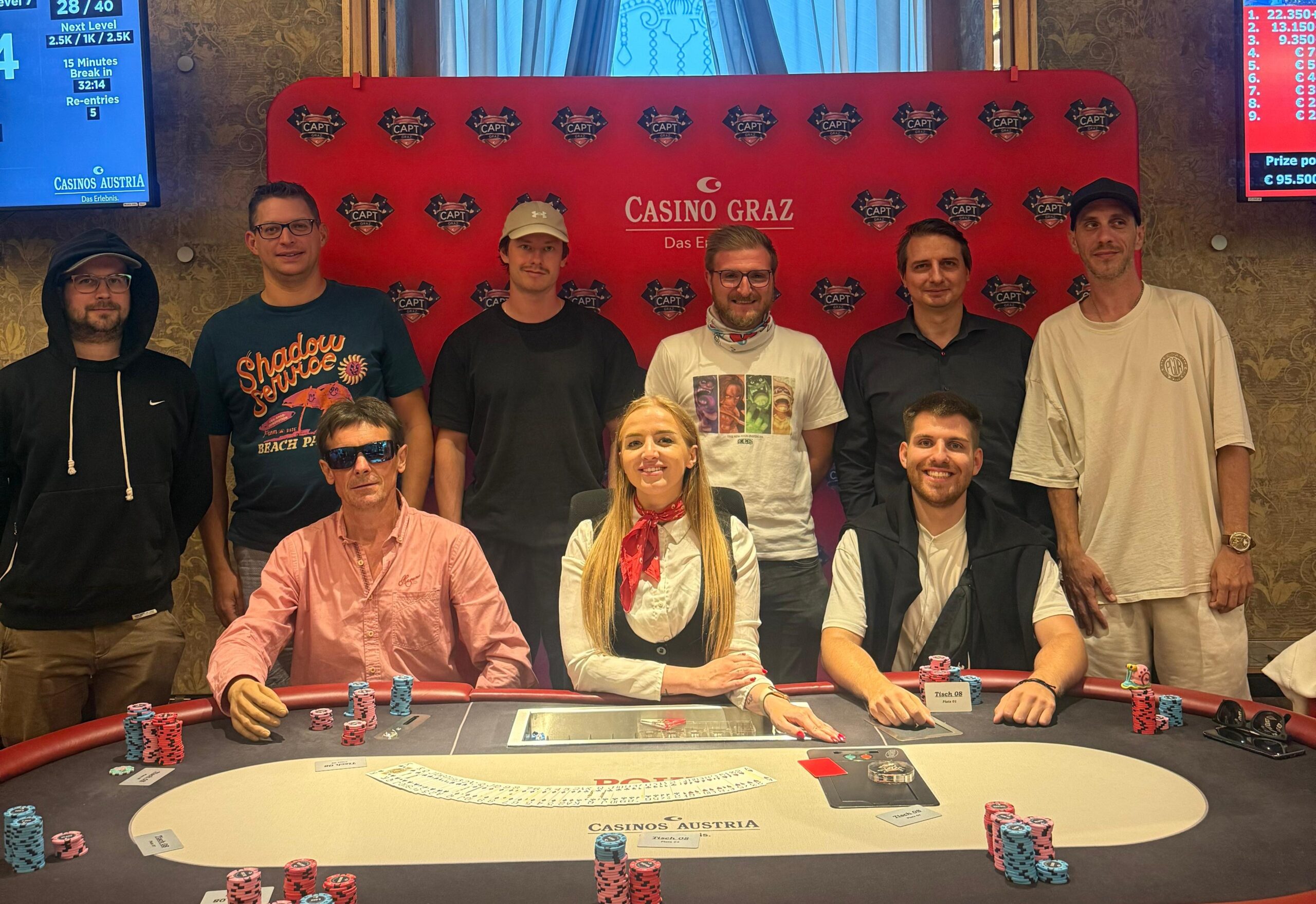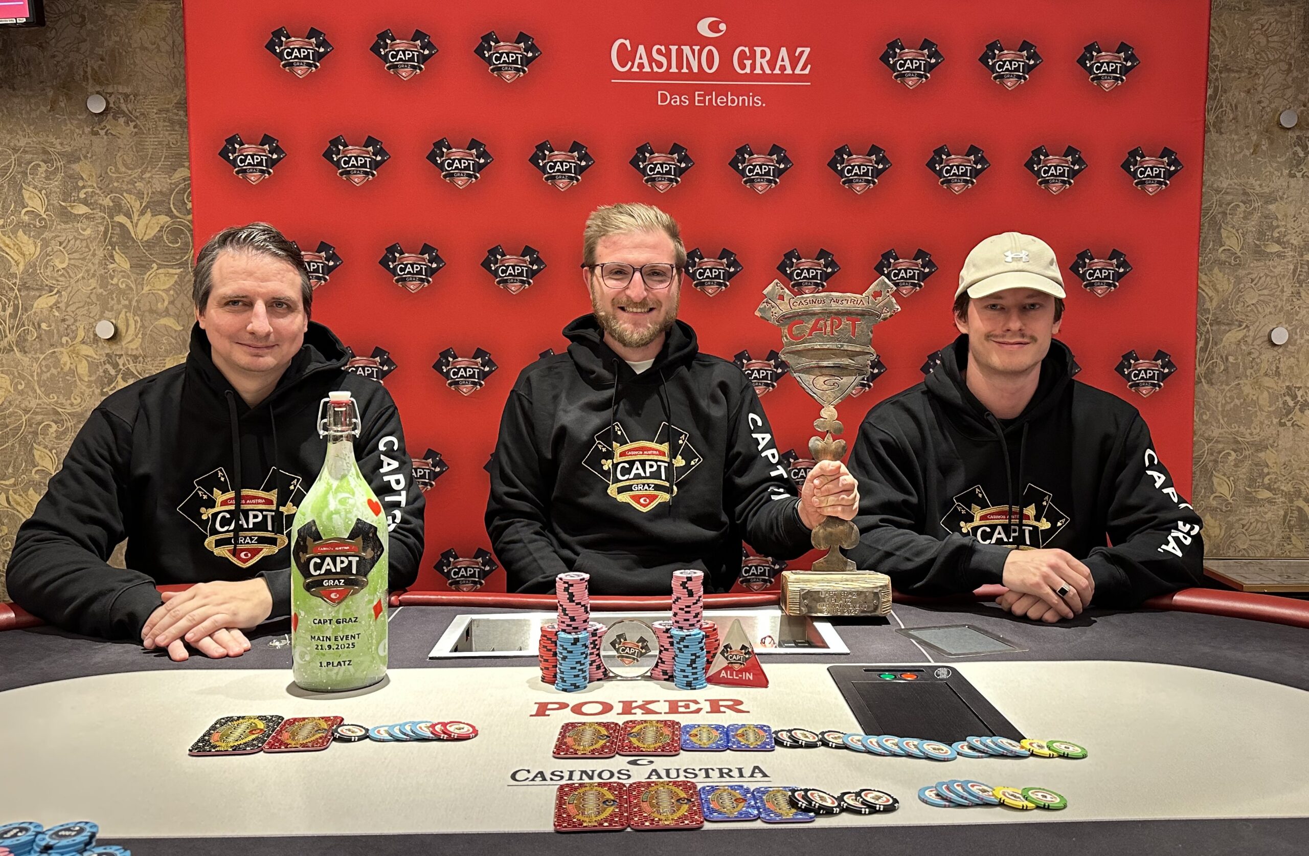 Nach einem Deal der letzten drei Spieler konnte Philipp Ruthard über den Sieg beim € 500 + 50 Main Event der CAPT Graz 2025 im Casino Graz jubeln, er nahm € 16.000 und das € 550 CAPT Million Ticket sowie auch eine Designflasche mit steirischem Kürbiskernöl mit.