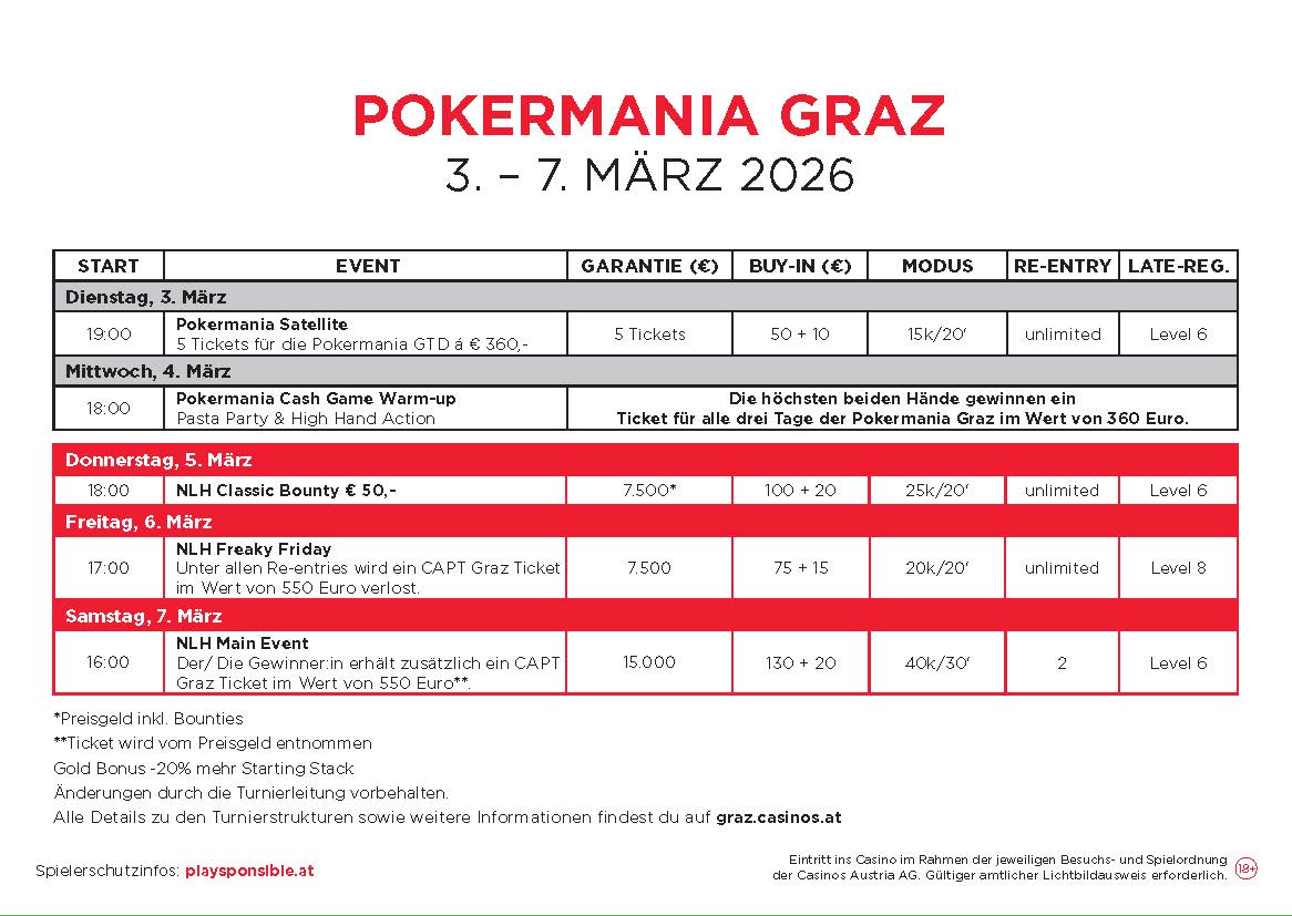 Auch an den Turniertagen kann man sich auf reichlich Cash Game Action freuen, täglich wird ab € 1/3 NLH bzw. € 2/2 PLO gespielt. Alle Details zum kompletten Pokerangebot findet Ihr auf graz.casinos.at.