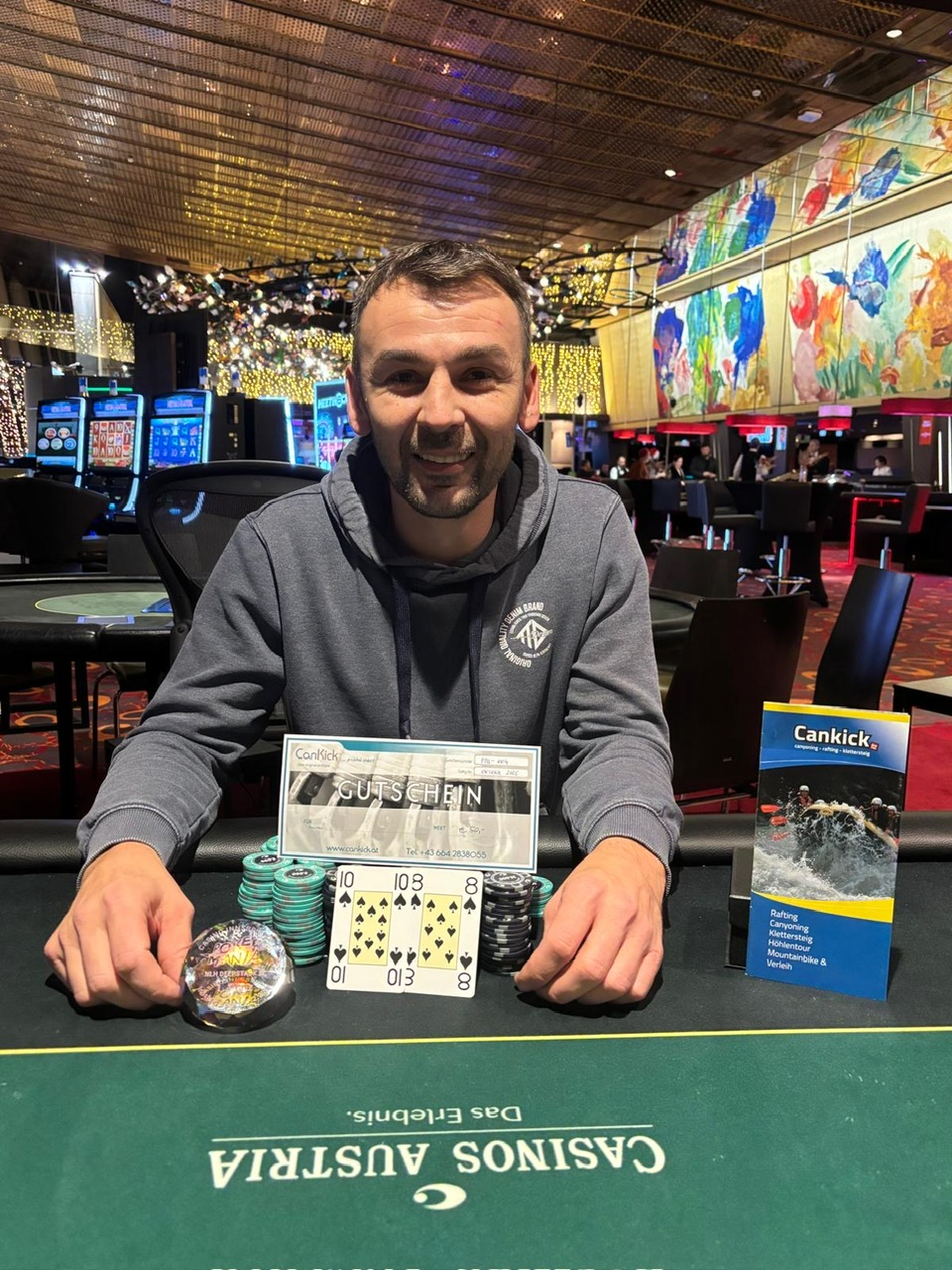 Das erste Turnier beim Pokermania X-mas Double war gestern das € 100 + 20 Deepstack XL, das mit 90.000 Chips (+ Gold/Early Bird Bonus) und 15 Minuten Levels gestartet wurde. € 6.000 waren garantiert, mit 90 Entries kam man aber locker darüber. Die € 9.000 wurden auf die ersten 13 Plätze verteilt, € 245 gab es als Min-Cash. Der Sieger hätte € 2.350erhalten, aber schon bei sechs verbliebenen Spielern kam es zu einem Deal. Manfred Pirchner holte dabei den Sieg für € 1.490 + € 50 Cankick Gutschein, Michael Sappl kassierte als Runner-up € 1.320.