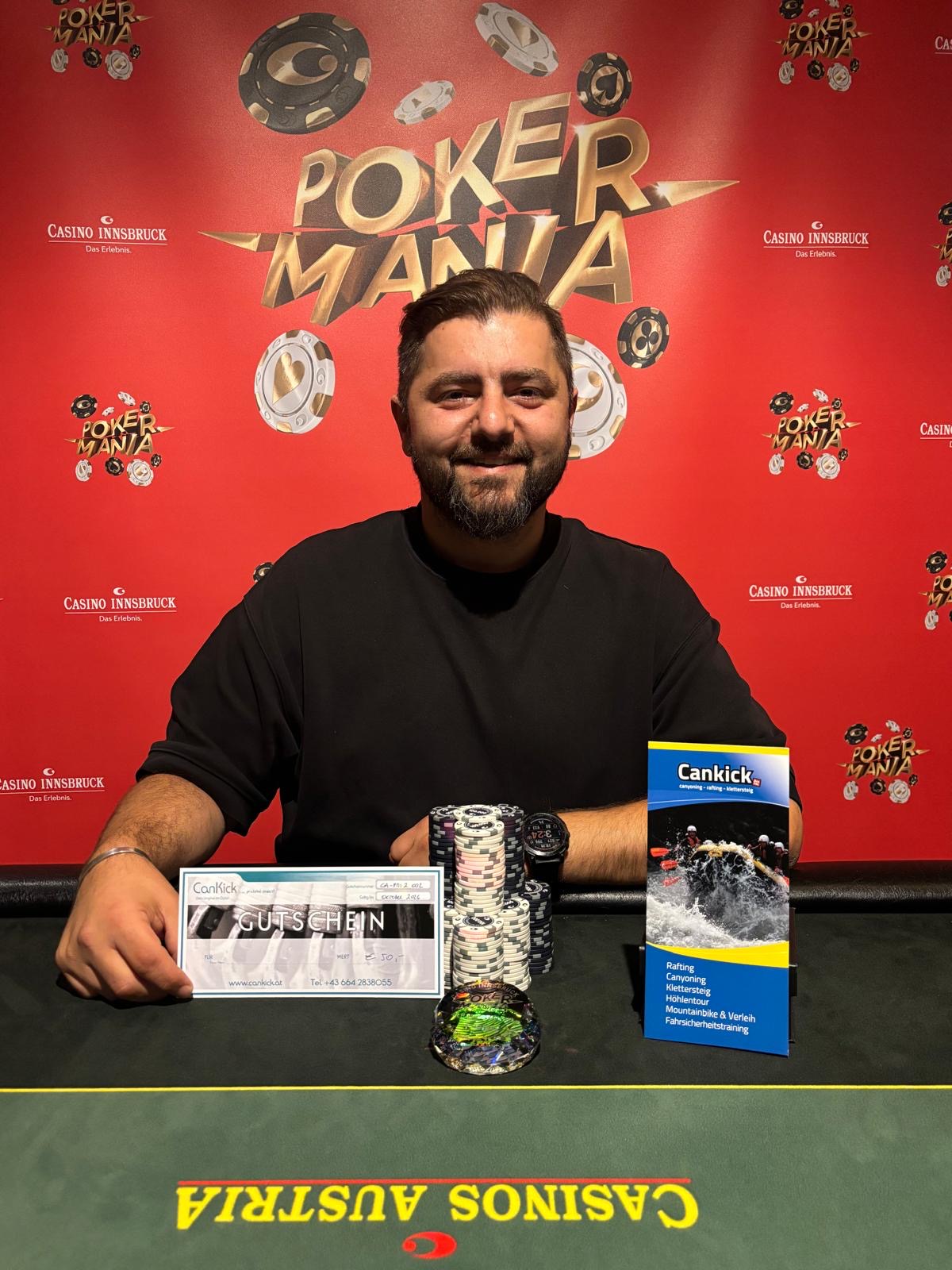 (Fast) Keine Pokermania im Casino Innsbruck ohne Sieg von Özkan Soysal. Dieses Mal schnappte er sich das € 130 + 20 Deepstack XXL nach einem Deal.