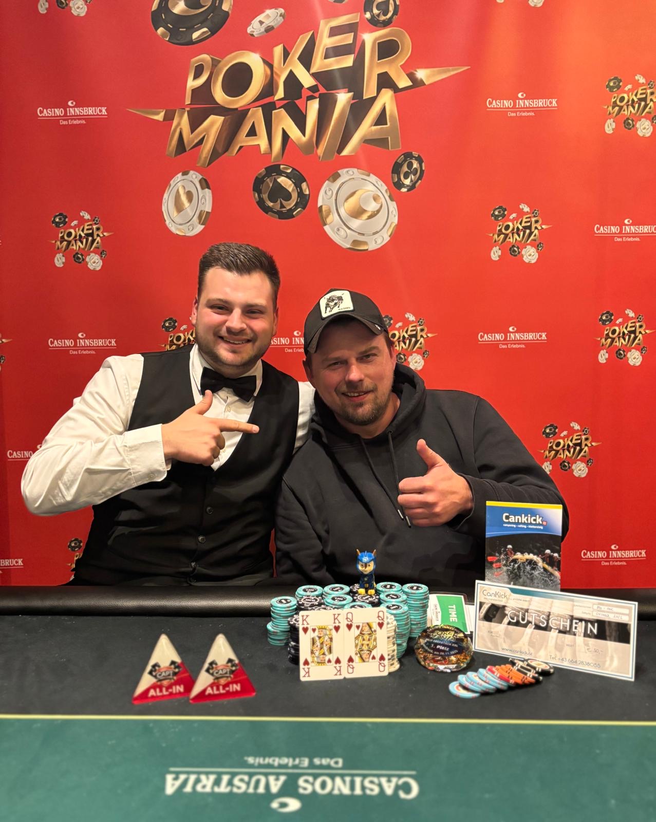 Auch gestern, den 6. November, entschied beim € 130 + 20 Deepstack XL (€ 8.000 GTD) der Pokermania Classic im Casino Innsbruck ein Flip den Sieg, Spanferkel war auf der glücklichen Seite der Varianz.