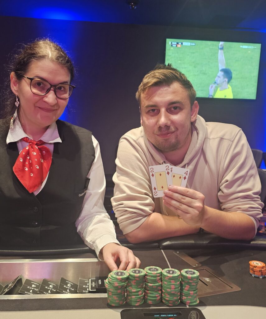 Wie immer ging es auch gestern, den 23. Oktober, mit 15.000 Chips und 15 Minuten Levels an die Tische. Man konnte bei gleichzeitiger Anmeldungen einen Freund mitbringen, der dann eben kostenlos starten konnte. 20 Teilnehmer und 13 Friends nahmen an den Tischen Platz, dazu kamen 13 Rebuys und noch 22 Add-Ons und so waren € 2.750 im Pot.