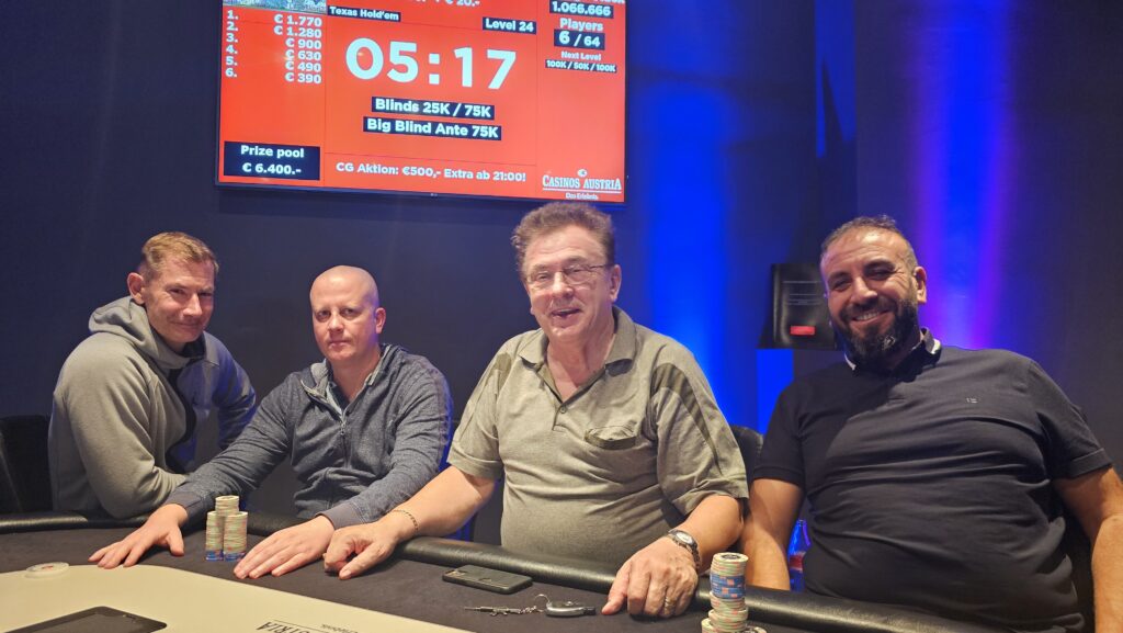 Am Final Table hatten alle € 240 sicher, die Action ließ doch ein bisschen nach. Philipp Höllinger verabschiedete nicht nur Peter Pfaffenwimmer, sondern auch Manuel und Johann Karst. Bei sechs Spielern wurde über einen ICM Deal geredet, man fand schnell eine Einigung und so war das Turnier kurz vor Mitternacht beendet. Philipp Höllinger kassierte als Sieger € 1.200, Vladimir Capic als Shortstack noch € 710.