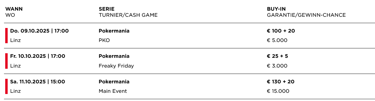 Die nächste Ausgabe des Bring Your Friend gibt es am 23. Oktober. Am 4. Oktober geht es ins € 100 + 20 Quartalsfinale, bei dem es für die Ranglisten Spieler wieder zusätzliche Chips gibt. Und von 9. bis 11. Oktober gibt es eine neue Ausgabe der Pokermania im Casino Linz.