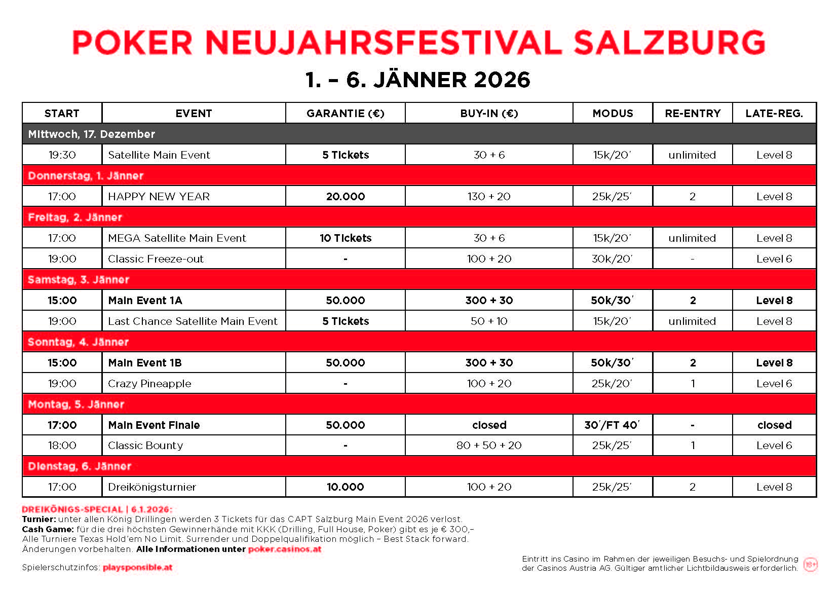 Neben den Turnieren gibt es wie immer auch reichlch Cash Game ab € 1/3 NLH bzw. € 2/2 PLO. Alle Infos zum kompletten Pokerangebot findet Ihr wie immer unter salzburg.casinos.at.