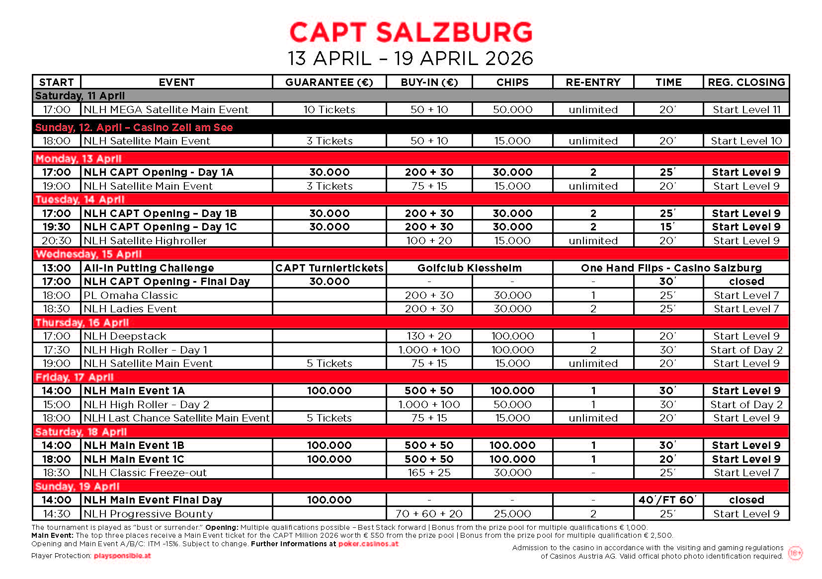 Der nächste Poker Cup kommt von 7. bis 9. Mai. Zuvor aber schon von 13. bis 19.April lädt die CAPT Salzburg 2026 an die Tische. Generell wird aber täglich im Casino Salzburg gepokert, bei den Cash Games wird bei den Blinds € 1/3 NLH bzw. € 2/2 PLO gestartet. Alle Infos gibt es wie immer unter salzburg.casinos.at.