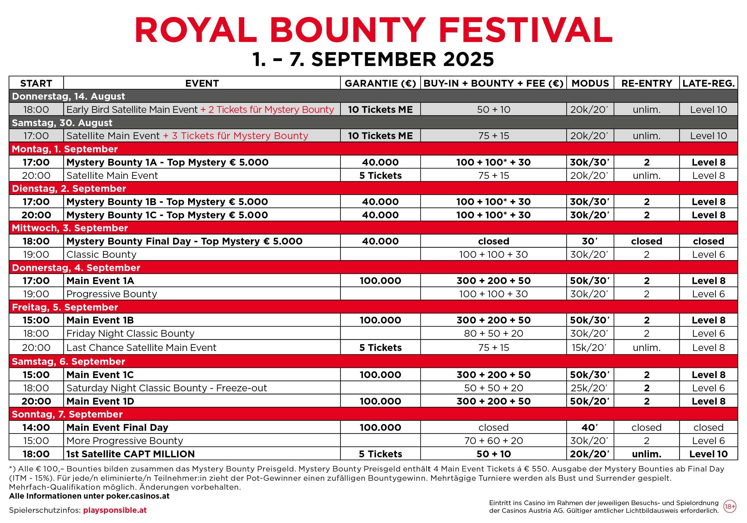 Wie schon letzten September eröffnet das Casino Salzburg das letzte Drittel des Pokerjahres mit dem Royal Bounty Festival. Die Pokerwoche hat zwei Highlights zu bieten. Den Anfang macht das € 100 + 100 + 30 Mystery Bounty mit einer Preisgeldgarantie von € 40.000. Es gibt drei Flights – Montag und Dienstag wird mit 30.000 Chips und 30 Minuten Levels in den regulären Flights gespielt, am Dienstag Abend gibt es noch den Turbo 1C (20′). Für alle verbliebenen Spieler geht es am Mittwoch dann ins Finale, hier geht es dann um Preisgeld und Mystery Bounties, wobei als Top Bounty € 5.000 warten.