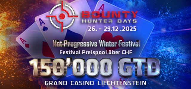 Auch am 24. Dezember bietet das Grand Casino Liechtenstein ein CHF 80 + 10 Turnier (CHF 5.000 GTD). Nach dem CHF 100 + 100 + 20XMas Bounty (CHF 10.000 GTD) am 25. Dezember geht es dann mit der Hot Progressive Week der Bounty Hunter Days powered by poker-trip.de von 26. bis 29. Dezember in die letzte Eventwoche des Jahres. Das CHF 170 + 80 + 40 PKO Main Event kommt mit CHF 100.000 GTD, dazu kommen noch reichlich Side Events. Mit ebenso täglichen Specials geht es dann ins Neue Jahr, ehe ab 7. Januar dann schon mit den Winter Poker Open das nächste Festival beginnt.