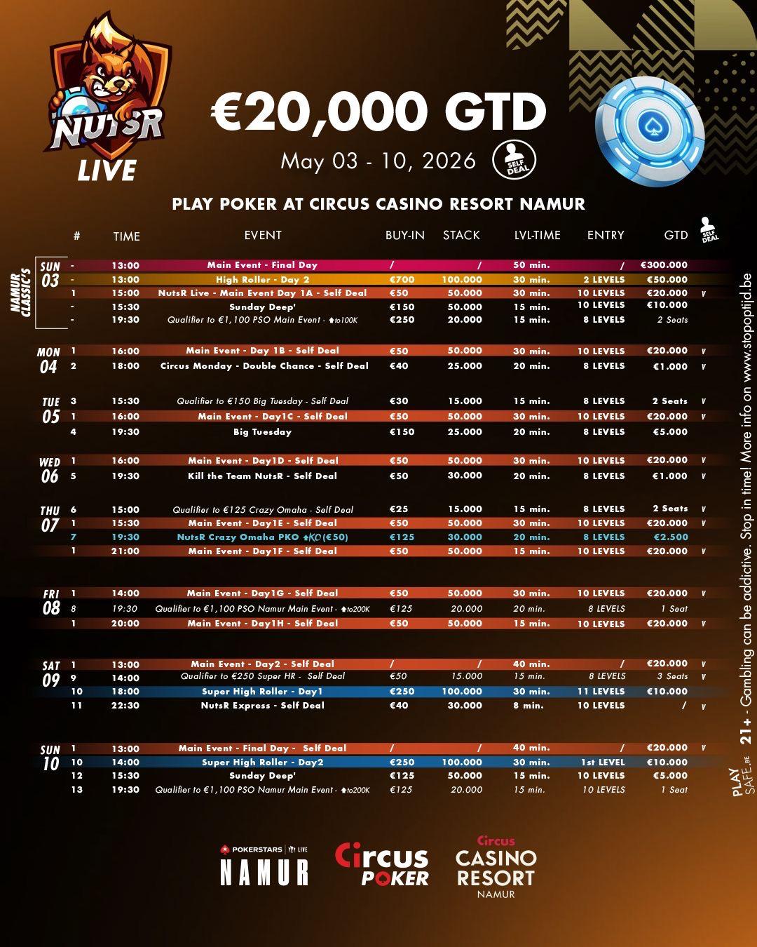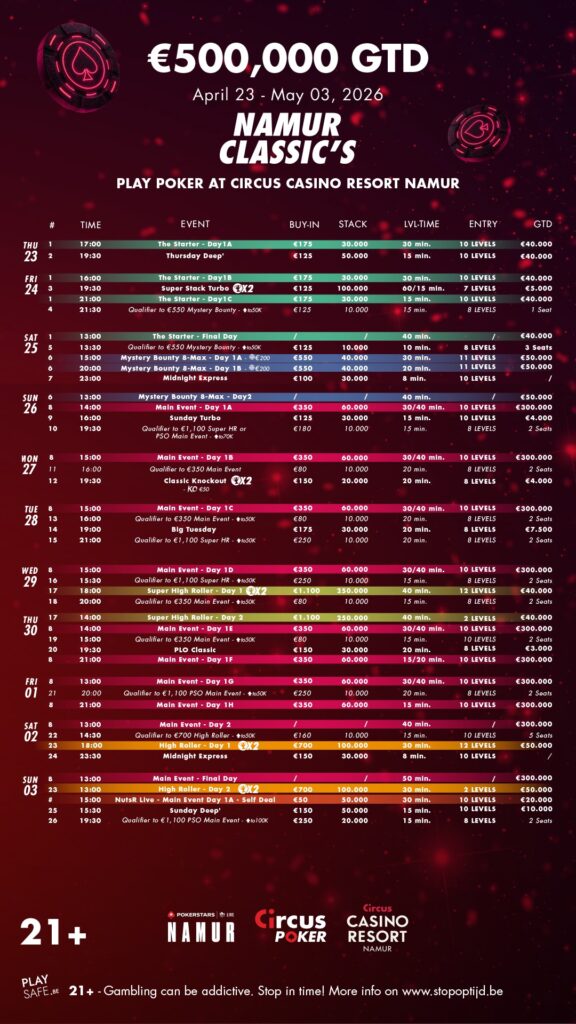 In den letzten Jahren hat sich das Circus Casino Resort Namur seinen Fixplatz als Festivallocation im europäischen Pokercircuit gesichert.  Ehe die PokerStars Open wieder nach Namur kommen, lädt man noch zu den Namur Classic’s mit einem € 350 Main Event (€ 300.000 GTD).