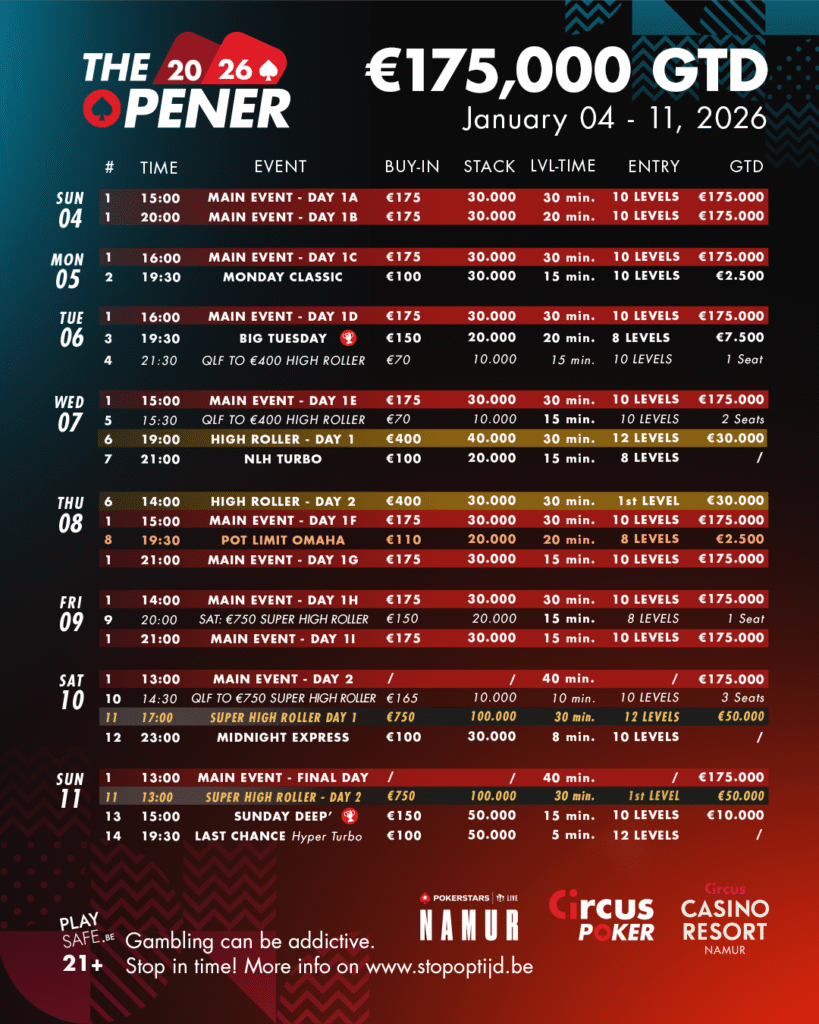 Als Side Event wartet das € 150 Sunday Deep (€10.000 GTD/50k/15′). Bei den Cash Games geht es wie immer ab € 2,5/€ 2,5 NLH bzw. € 5/5 PLO los. Details zum kompletten (Poker)Angebot und die Option, Tickets zu kaufen findet Ihr unter circus-poker.com, Dort findet Ihr auch wie immer die Livecoverage, das Passwort ist „poker“.