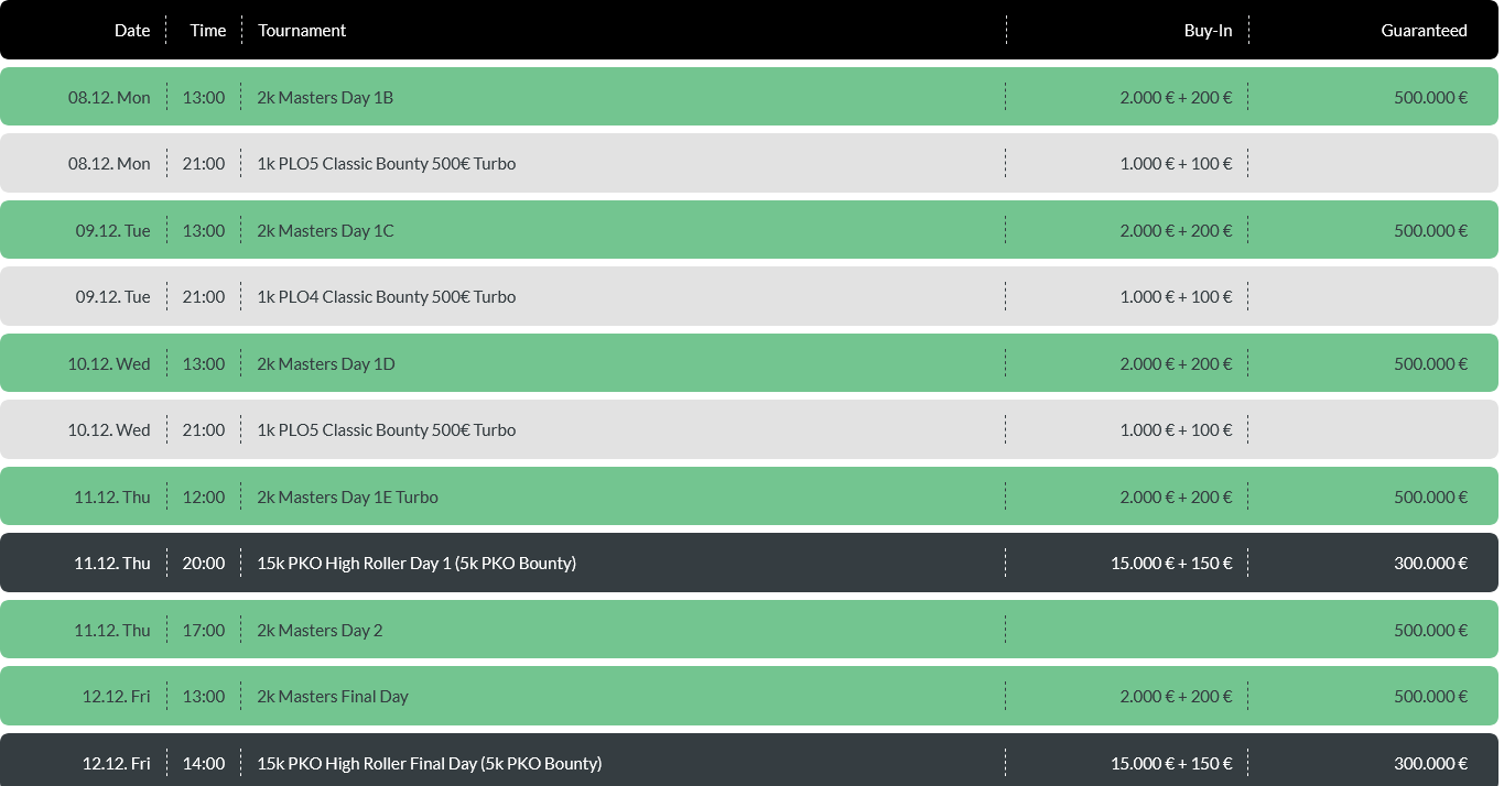 Wer vier Karten mag, der wird die 2k Masters lieben. Und Prag im Advent ist ohnehin immer eine Reise wert. Bei Fragen wendet Euch gerne an Rasti (+420 728 808 005) oder Richi (+420 725 543 607) via WhatsApp, die beiden helfen gerne weiter. Alle Infos zum Stopp in Prag findet Ihr wie immer auf diamondpokerseries.com.