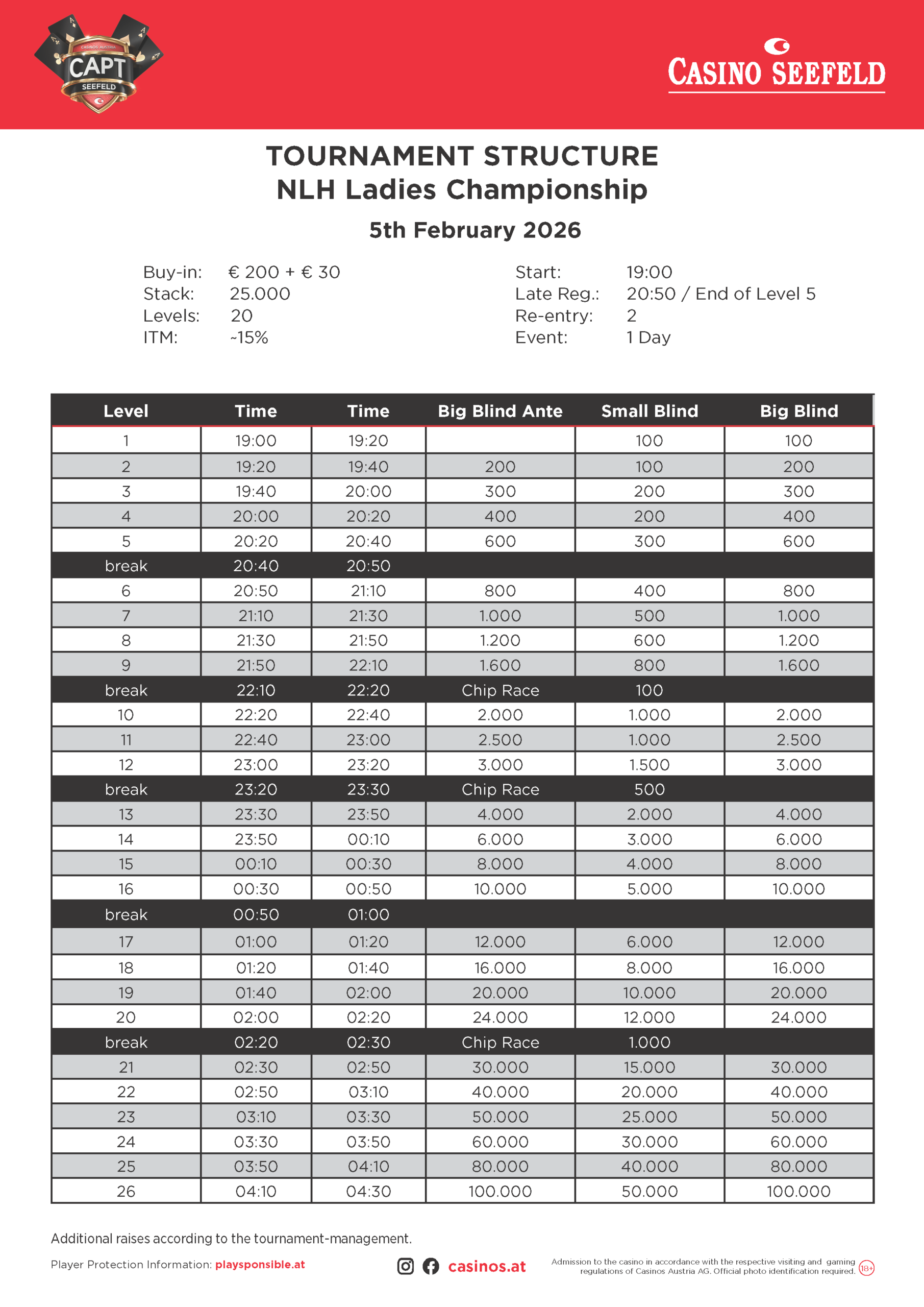 Mit 21 von 46 Ladies sind wir in Level 11, die Blinds 1k/2,5k/2,5k