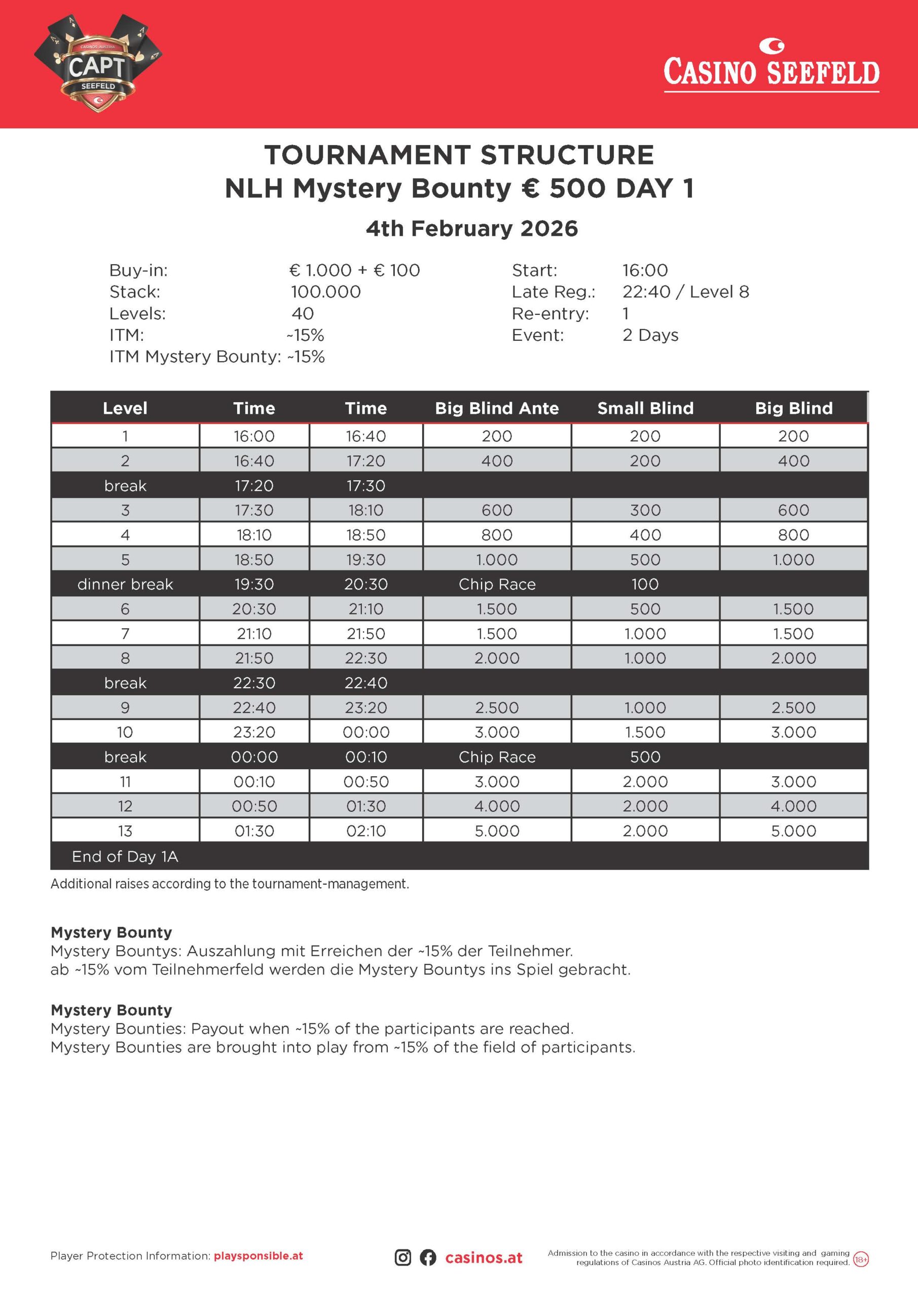 Auch das € 500 + 500 + 100 Mystery Bounty darf bei der CAPT Seefeld nicht fehlen. Letztes Jahr waren es bei zwei Starttagen 182 Entries, Sieger Saftmänni kassierte € 17.530. Dieses Jahr wird mit nur einem Flight gespielt, 100.000 Chips und 40 Minuten Levels können sich aber sehen lassen und sorgen für ein angenehmes 1k Turnier.