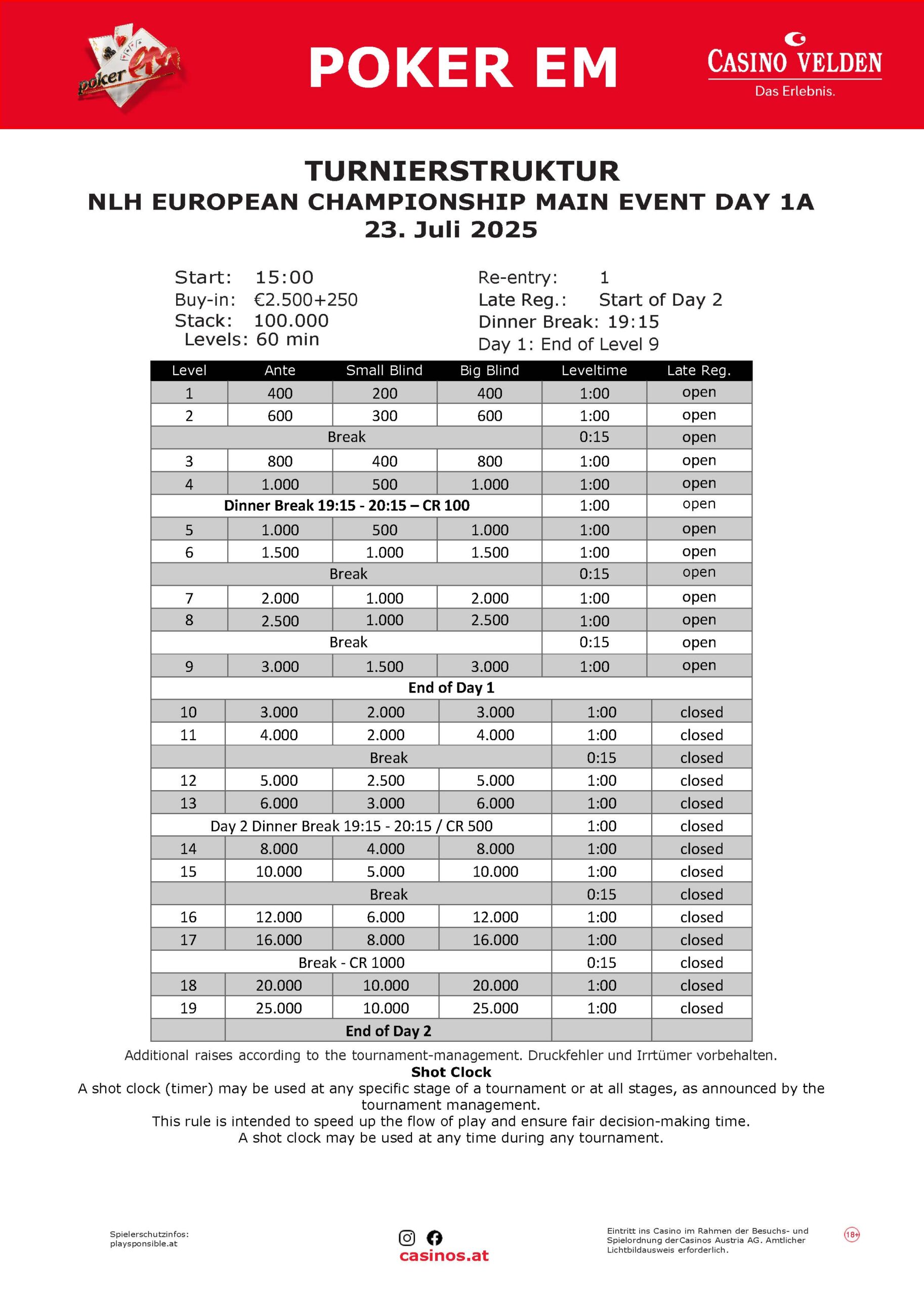 Auch das Main Event war natürlicch auf Dinner Break und Spanferkel essen, es laufen die letzten Minuten von Level 3. Die Blinds sind noch 400/800/800, gleich dann 500/1000/1000. Aktuell stehen 121 von 137 auf der Uhr