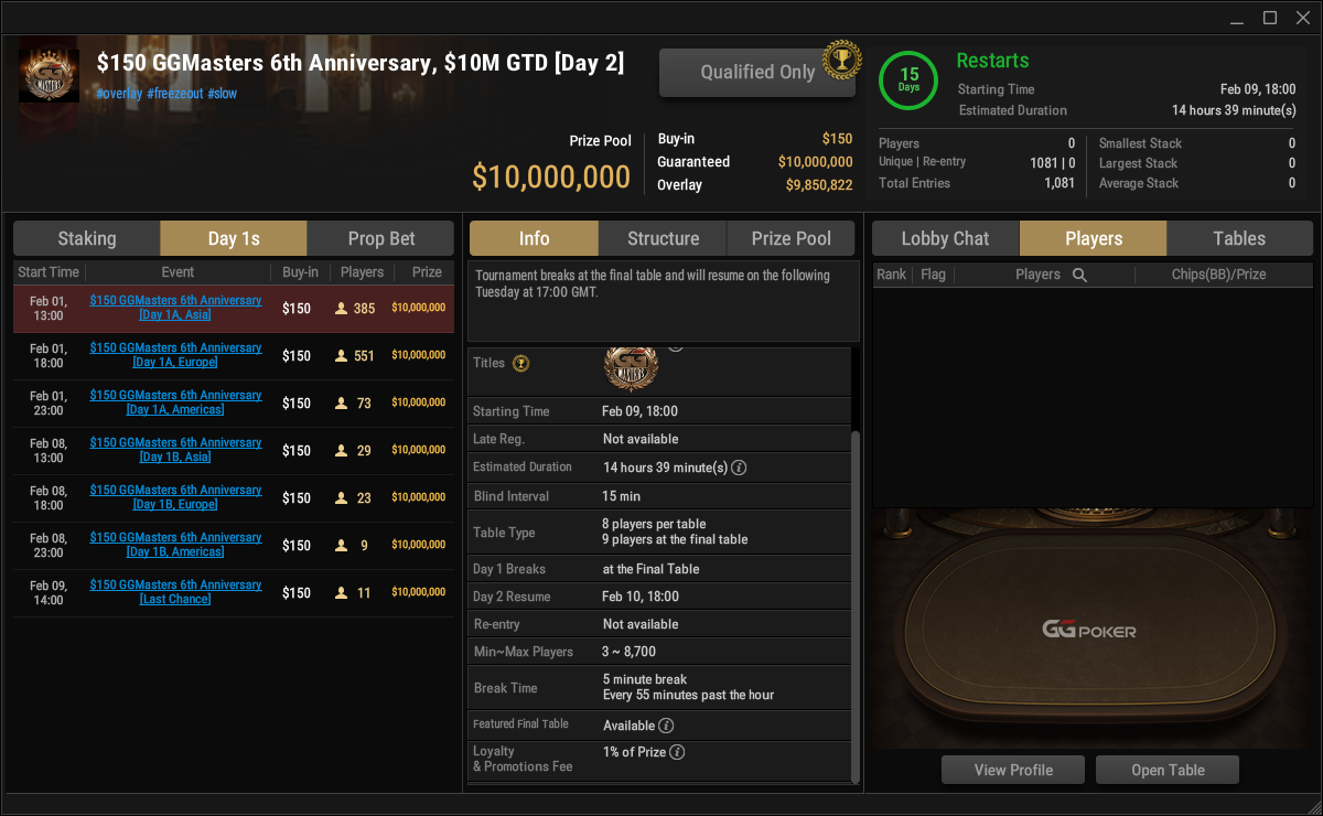 08.02.2026So18:00$1.050 GGMasters HR Special. $1M GTD [2-Day Event]$1.050$1.000.000