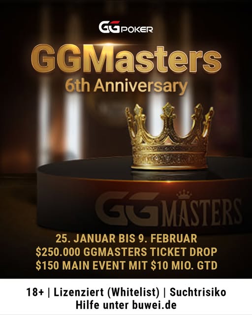 Die Feierlichkeiten rund um die GGMasters beginnen bereits am 25. Januar und es gibt kostenlose Tickets im Wert von $250.000 zu gewinnen. Der Ticketdrop findet random bei allen GGMasters Turnieren statt, es gibt $25, $108, $150, $320 und $1.050 Tickets zu gewinnen. Und täglich gibt es Freezeout Action. 87 „Side Events“ mit mehr als $12.000.000 an Preisgeldern warten. Eigentlich ist es  die gewohnte tägliche GGMasters Schedule, aber mit fetteren Garantiesummen.
