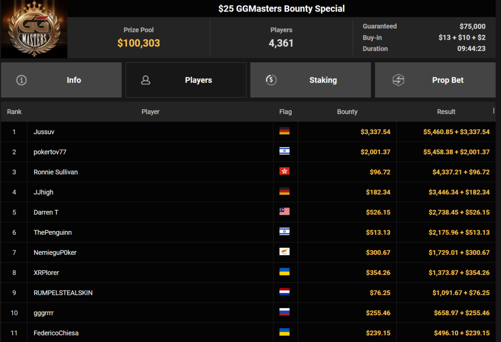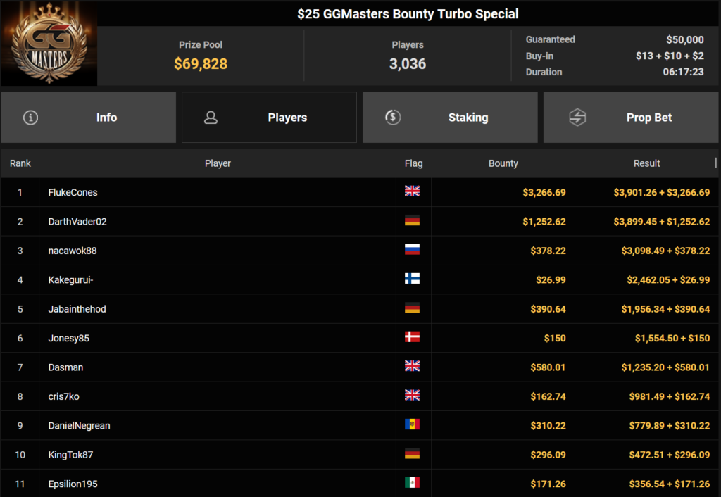 Dicke Schecks gab es aber dafür beim $25 GGMasters Bounty, wo sich Jussuv den Sieg für $5.460 + $3.337 holen konnte. Beim $25 GGMasters Bounty Turbo scheiterte DarthVader02 erst im Heads-up und kassierte $3.899 + $1.252.