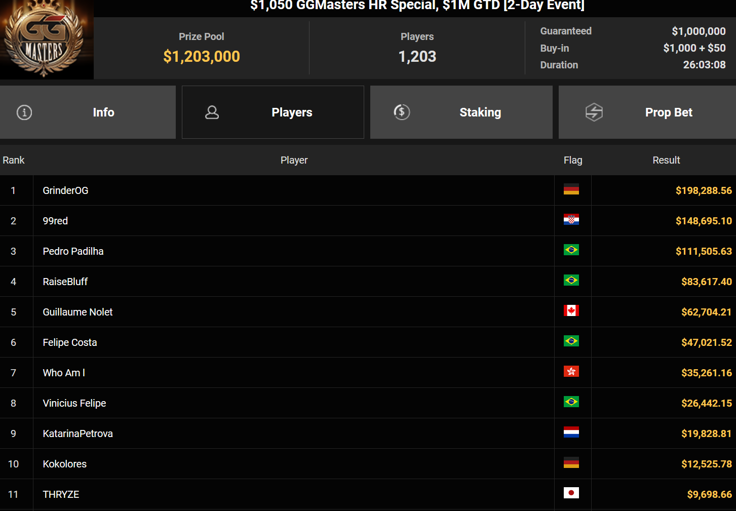 Und dann war da noch das zweitägige $1.050 GGMasters Special HR. 1.203 Starter waren es, das Finale wurde gestern gspielt. GrinderOG konnte sich durchsetzen, was ihm satte $198.288 bescherte.