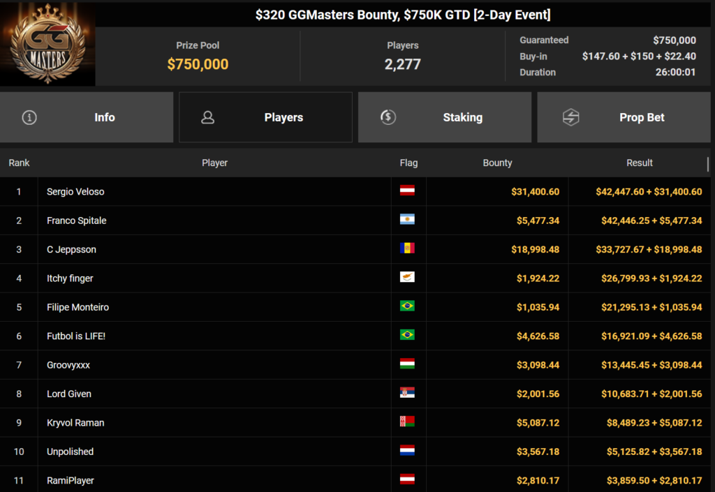 Beim $320 GGMasters Bounty gab es noch einen Sieg unter österreichischer Fahne, Sergio Veloso holte den Sieg für $42.447 + $31.400.