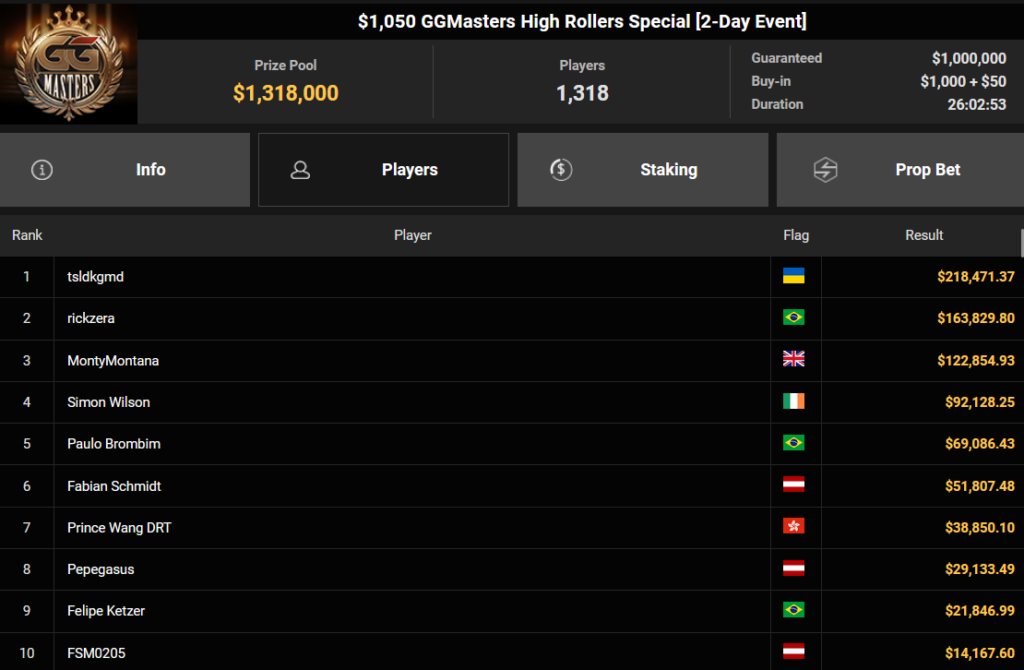 Beim $1.0505 GGMasters High Roller war es gestern Abend für neun Spieler der 1.318 Starter ins Finale gegangen, Fabian Schmidt und Pepegasus waren noch dabei, alledings musste sich Pepegasus gleich mit Rang 8 ($29.133) verabschieden und auch Fabian Schmidt kam über Rang 6 ($51.807) nicht hinaus. Der Ukariner tsldkgmd war der Chipleader und kassierte am Ende für den Sieg $218.471.