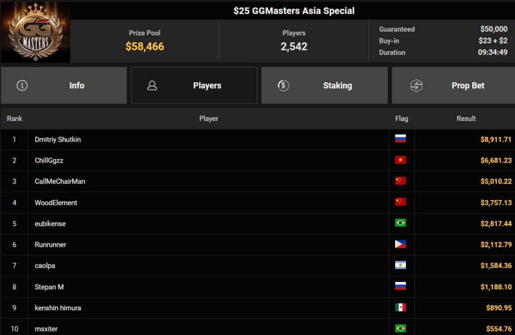 | 31.01.2026 | Sa | 12:00 | $25 GGMasters Asia Special | $25 | $60.000 |