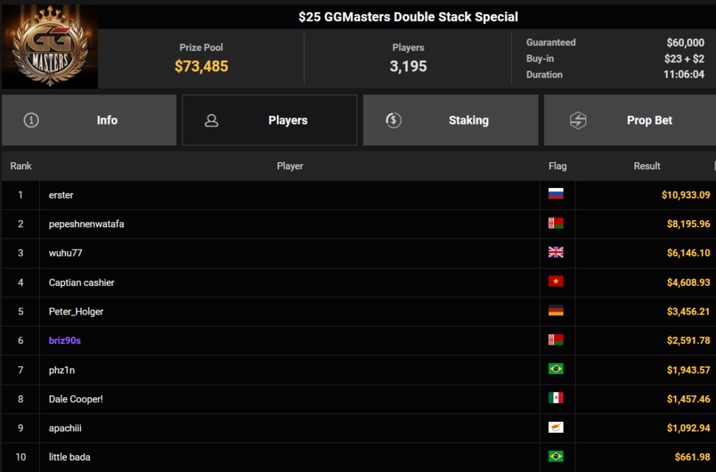 | 03.02.2026 | Di | 20:00 | $25 GGMasters Bounty Special | $25 | $100.000 |