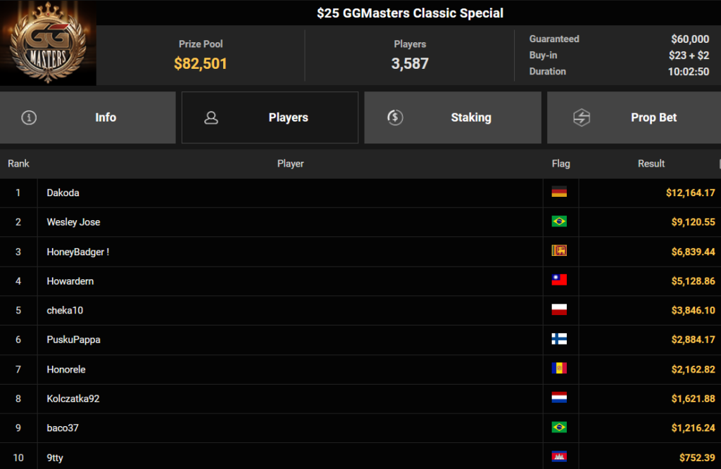 Auch wenn die DACHs nicht allzu zahlreich an den Final Tables bei den gestrigen Masters vertreten waren, so fiel die Bilanz durchaus erfreulich aus. Grund dafür ist Dakoda, der sich beim $25 GGMasters Classic bei 3.587 Entries durchsetzen konnte und den Sieg für $12.164 einfuhr.