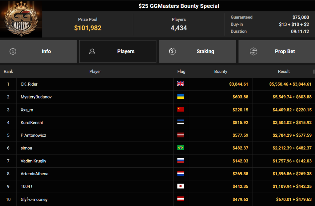 | 27.01.2026 | Di | 20:00 | $25 GGMasters Bounty Special | $25 | $100.000 |