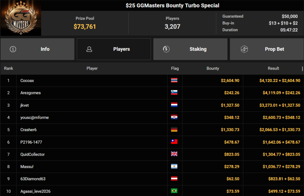 | 05.02.2026 | Do | 22:00 | $25 GGMasters Bounty Turbo Special | $25 | $60.000 |