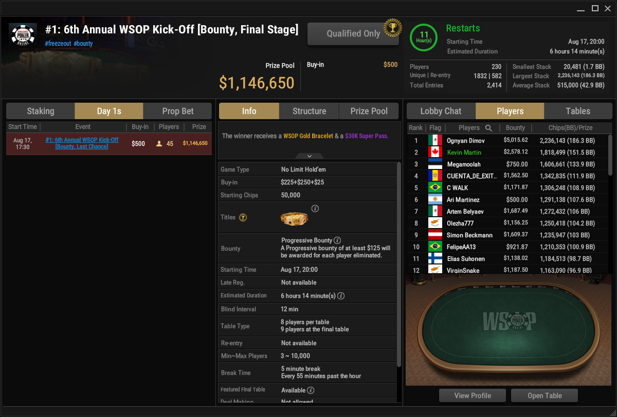 | Aug 17 | 18:00 | #1 | 6th Annual WSOP Kick-Off [Bounty. Final Stage] | $500 | – |