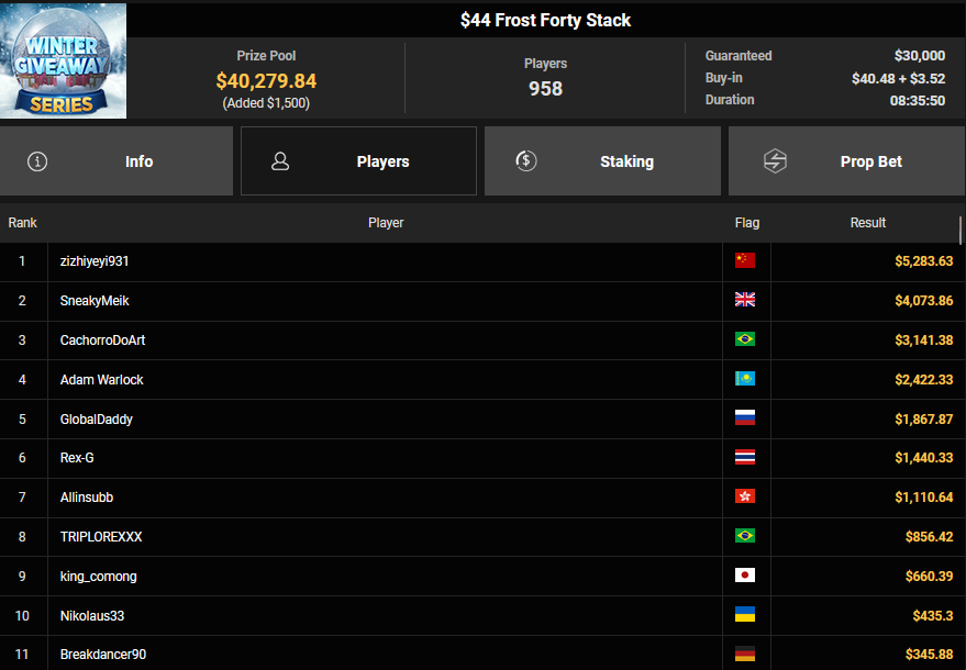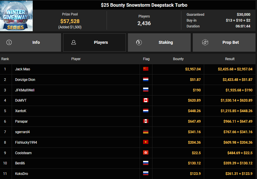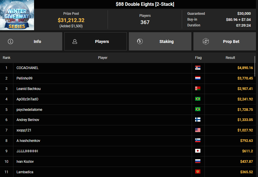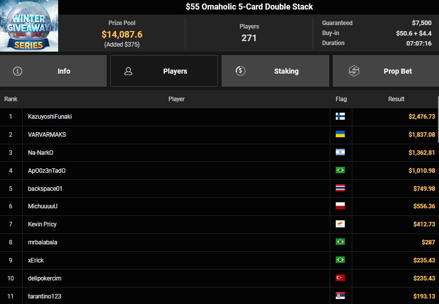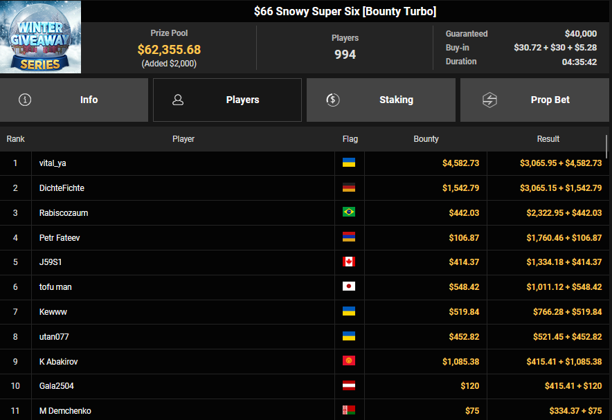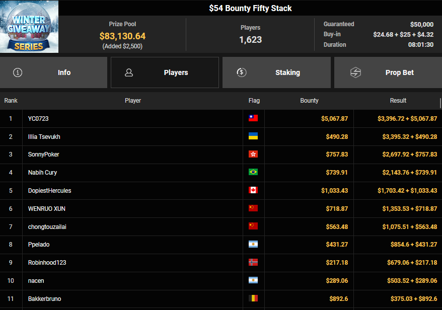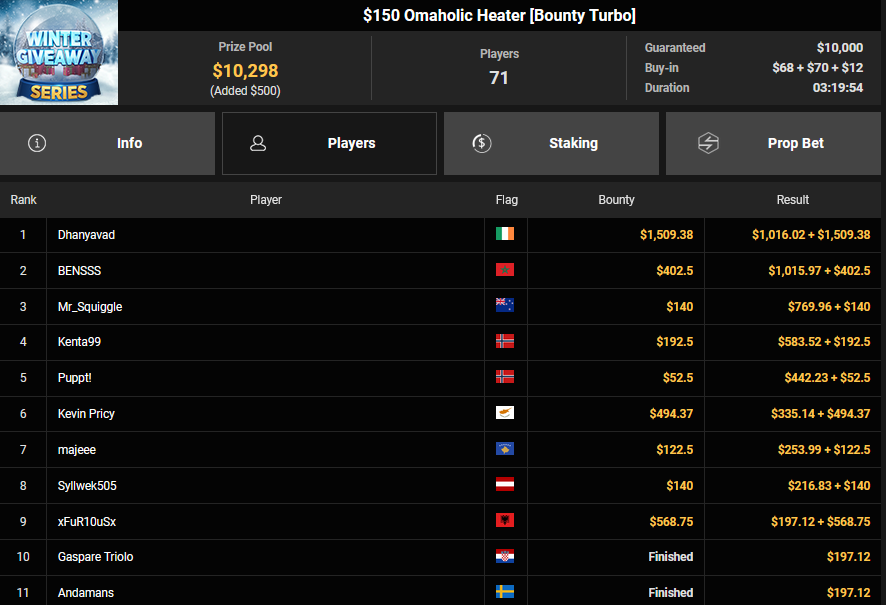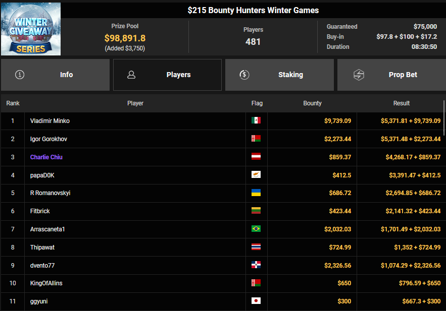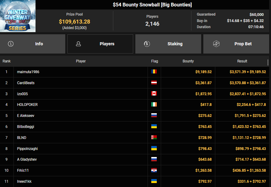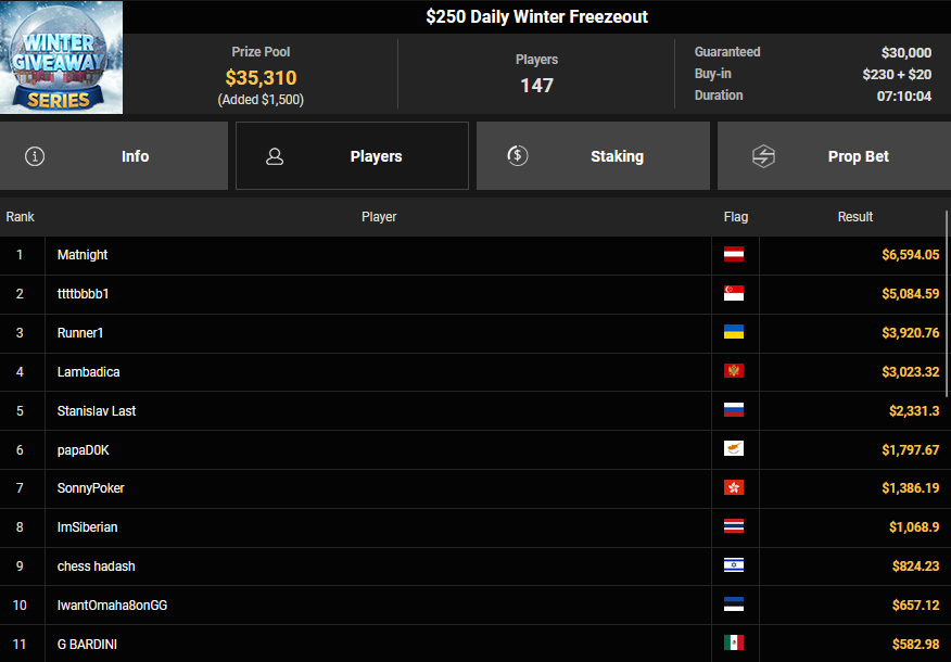 BVB1979 kam beim $15 Bounty Hunters Holiday auf Rang 3 ($2.215 + $843), Matnight holte den Sieg beim $250 Daly Winter Freezeout und damit $6.594 Preisgeld. Dirkisch setzte sich beim $77 Snowy Sevens Turbo durch ($5.883), CardiBeats wurde beim $54 Bounty Snowball Runner-up für $3.570 + $3.361.