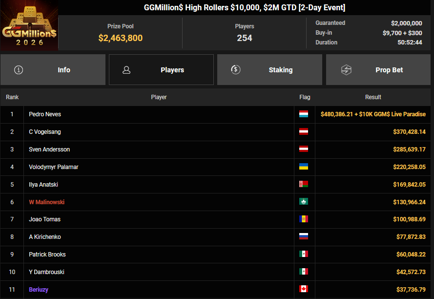 Das Duell dauerte nicht allzu lange, für Christoph Vogelsang gab es dieses Mal kein Comeback. Platz 2 zahlte ihm $370.428, Pedro Neves kassierte $480.386 + $10k GGMillion$ Live Paradise Package.