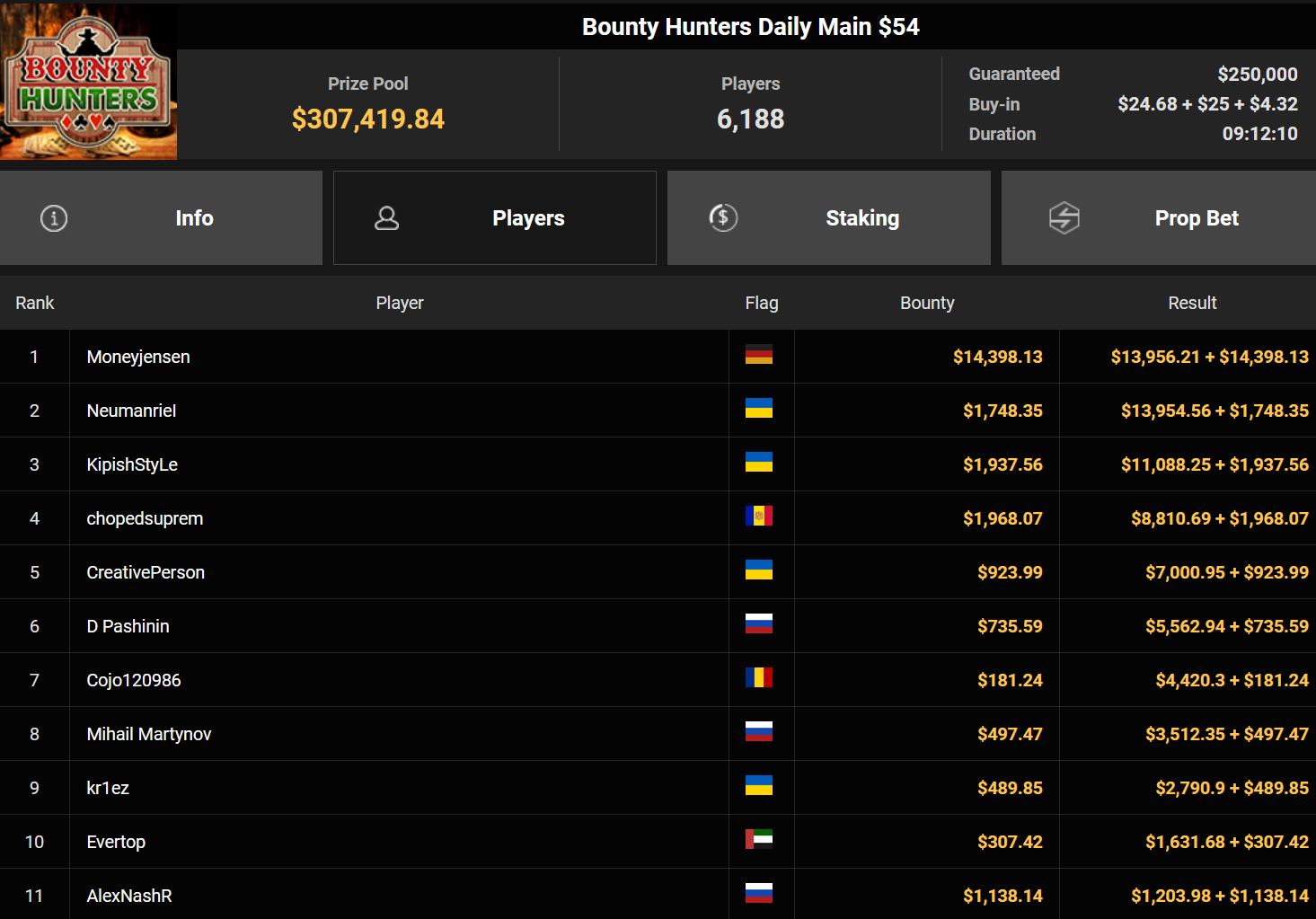Moneyjensen holte das $54 Bounty Hunters Daily Main. 6.188 Entries waren es, $13.956 + $14.396 gab es für Sieger Moneyjensen.