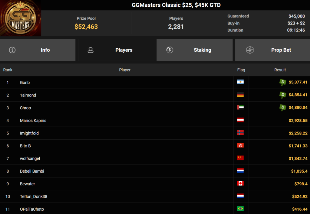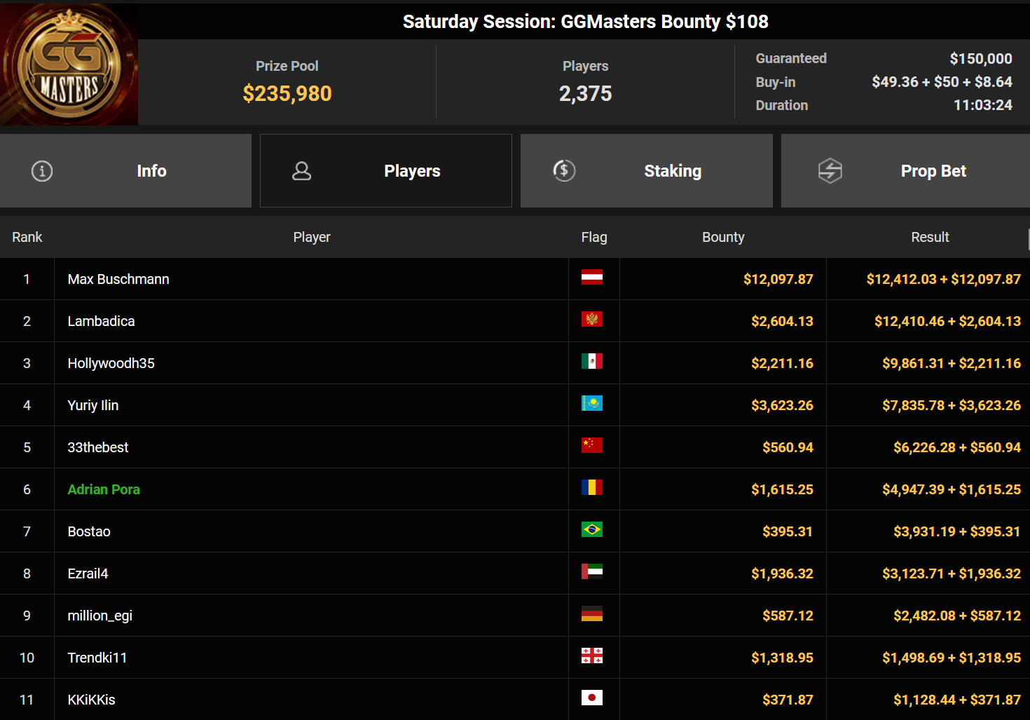 Max Buschmann blieb auf der Siegesstraße und schnappte den Sieg beim $108 GGMasters Bounty ($12.412 + $12.0997). 1almond wurde Runner-up bei den $25 GGMasters Classic und kassierte $4.854.