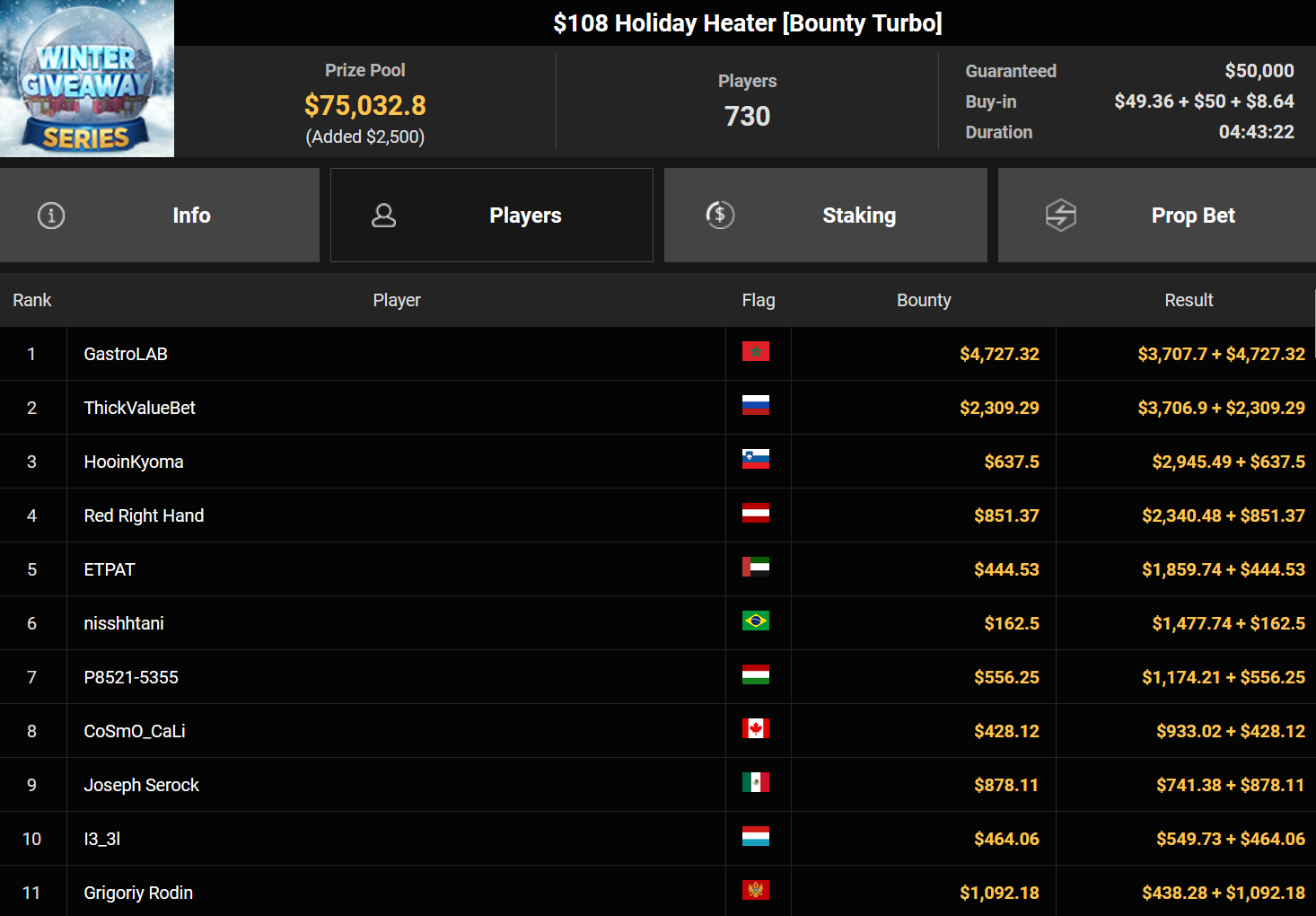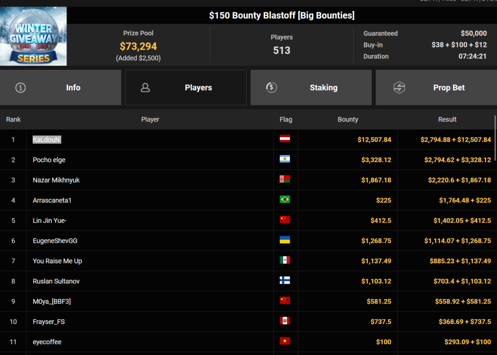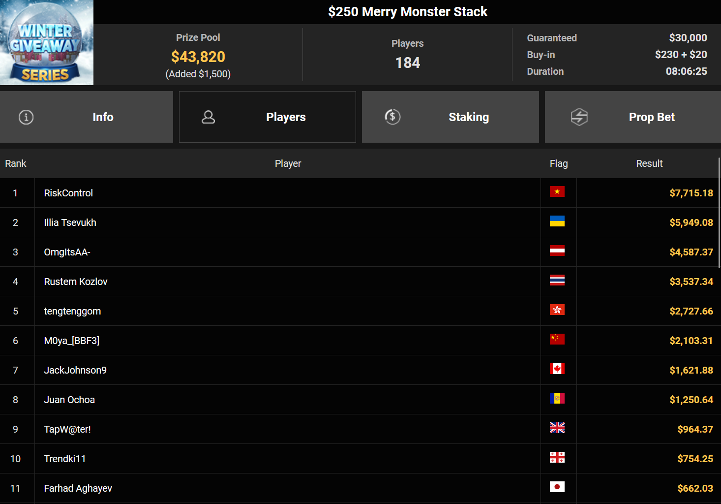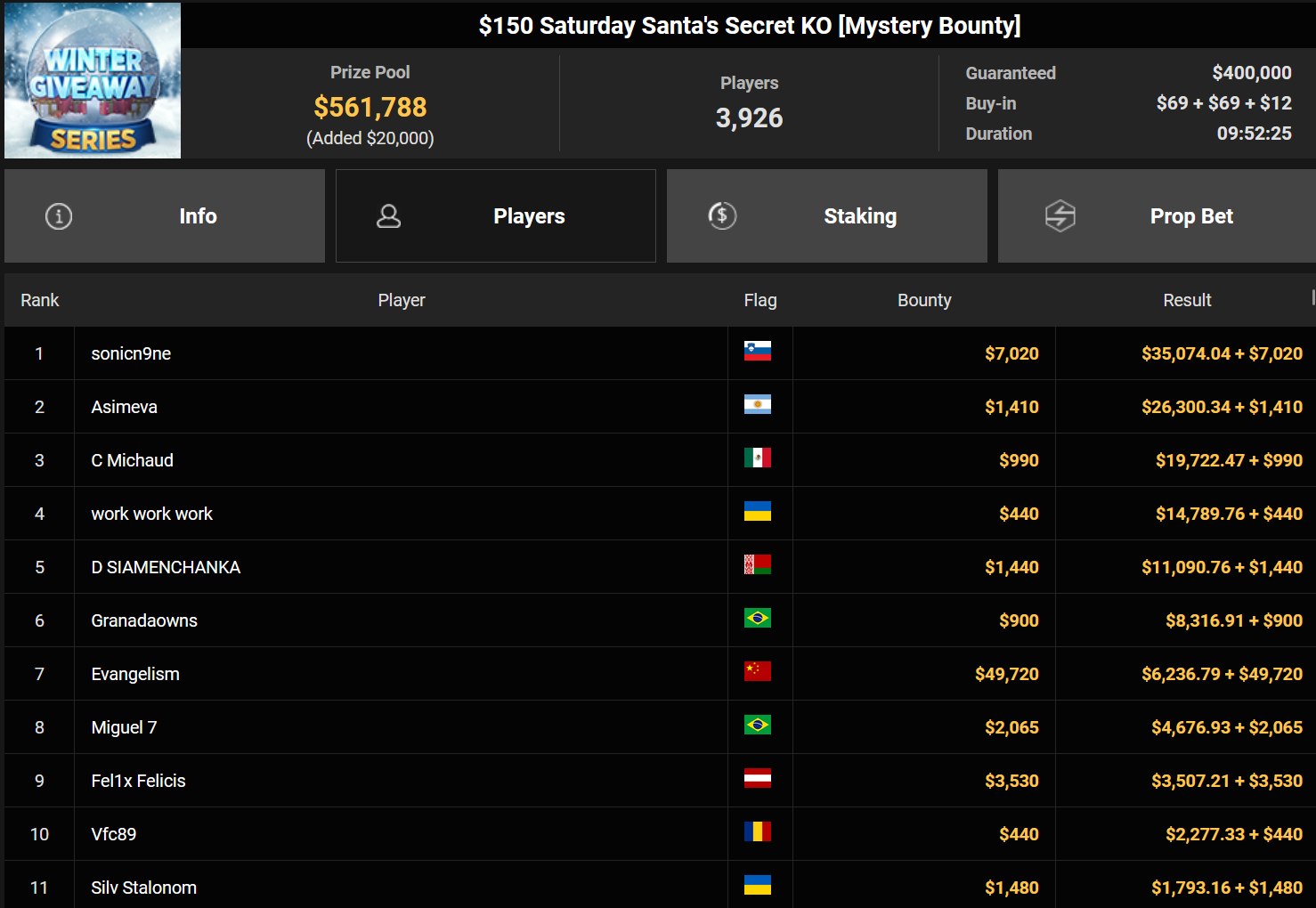 OmgItsAA- kassierte $4.587 für Platz 4 beim $250 Merry Monsters Stack, KaLdouN sicherte sich den Sieg beim $150 Bounty Balstoff für $2.794 + $12.507.