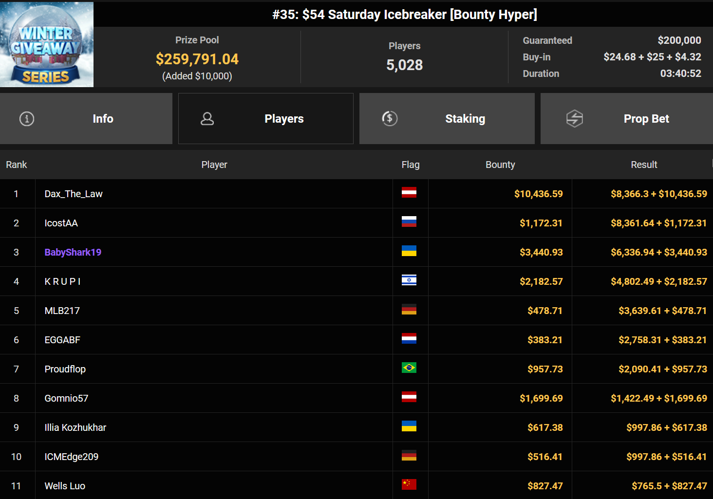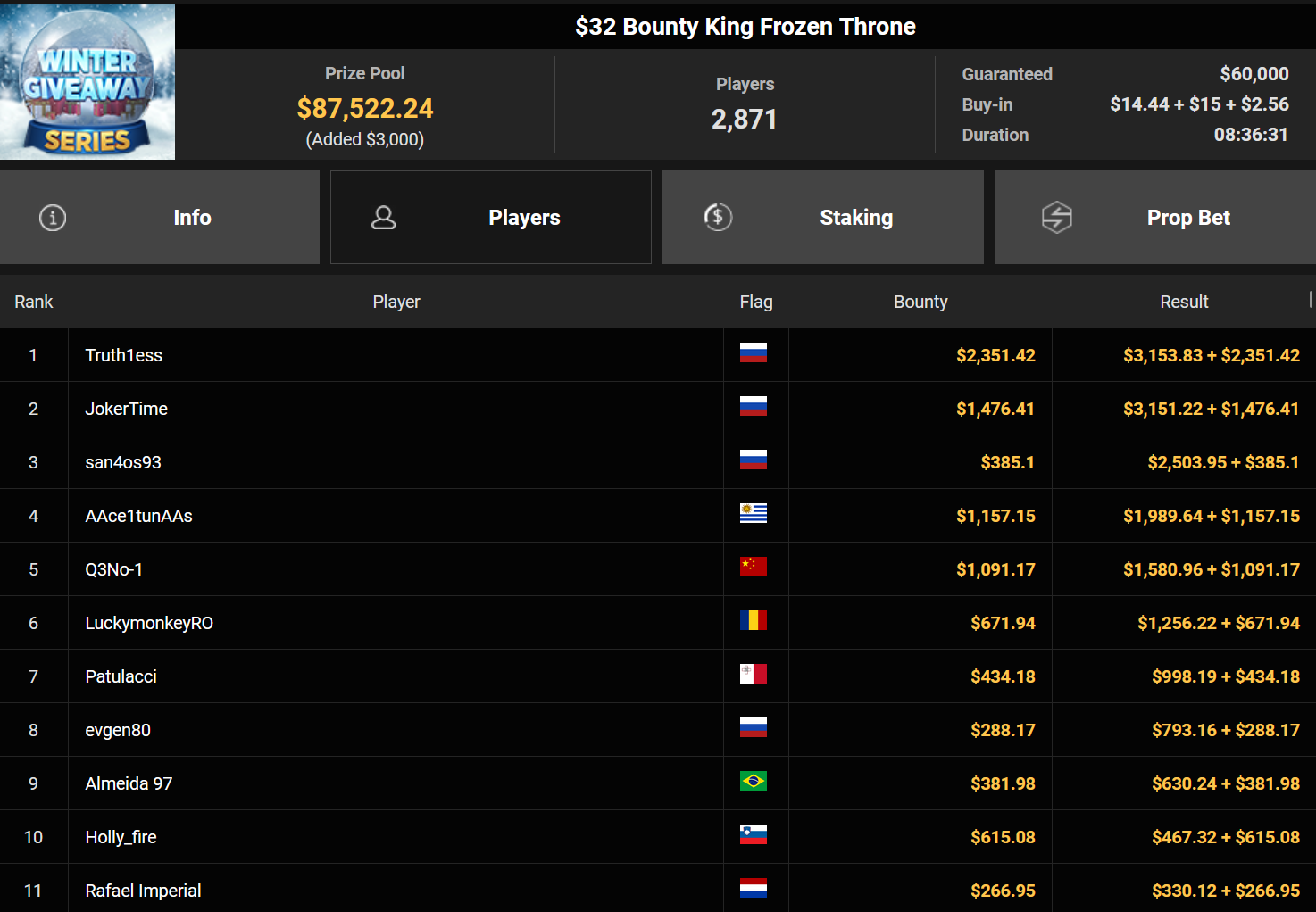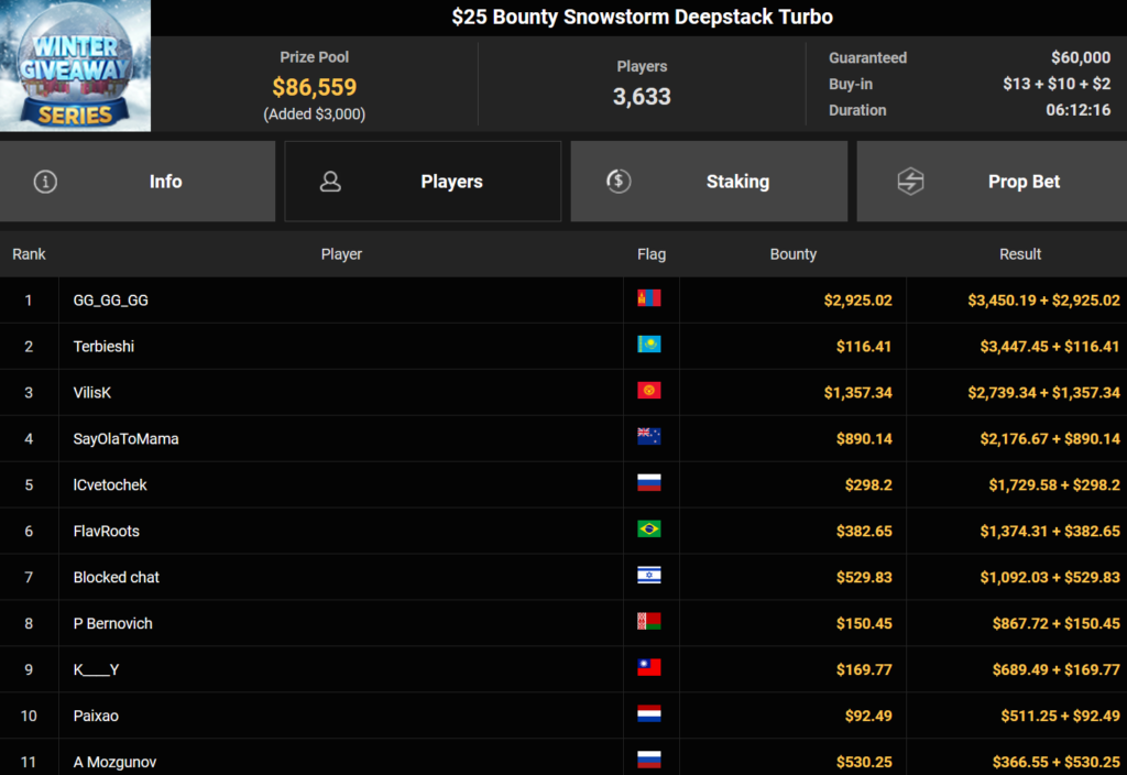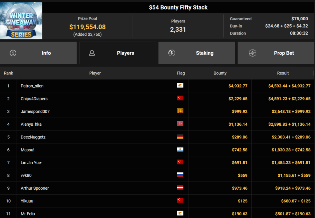 OmgItsAA- kassierte $4.587 für Platz 4 beim $250 Merry Monsters Stack, KaLdouN sicherte sich den Sieg beim $150 Bounty Balstoff für $2.794 + $12.507.